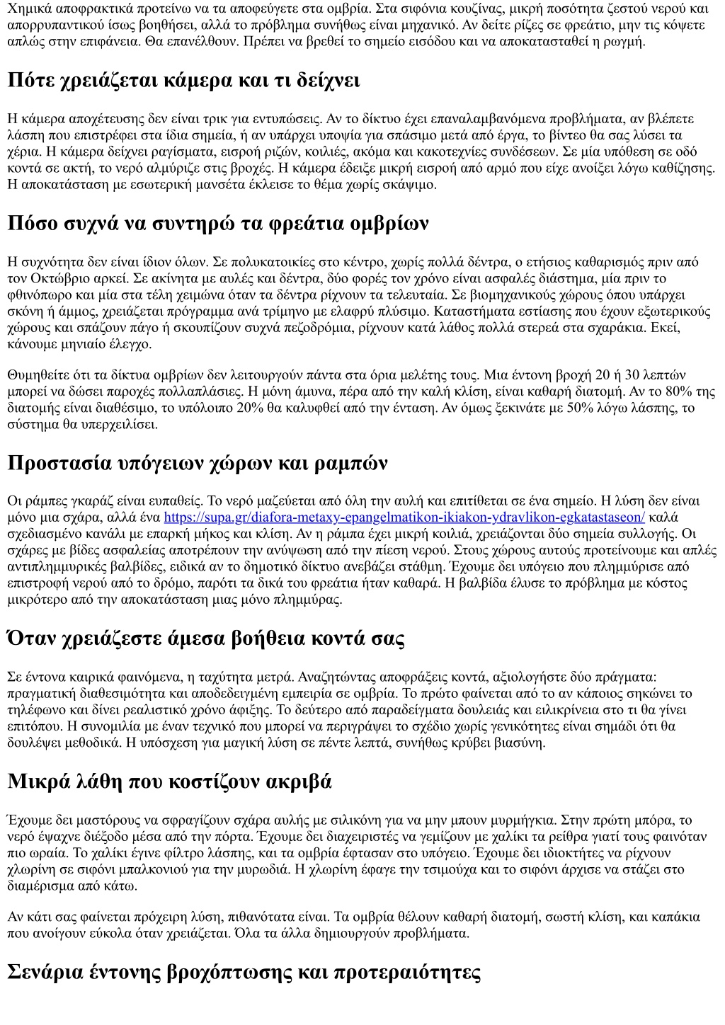 Χημικά αποφρακτικά προτείνω να τα αποφεύγετε στα ομβρία. Στα σιφόνια κουζίνας, μικρή ποσότητα ζεστού νερού και απορρυπαντικού ίσως βοηθήσει, αλλά το πρόβλημα συνήθως είναι μηχανικό. Αν δείτε ρίζες σε φρεάτιο, μην τις κόψετε απλώς στην επιφάνεια. Θα επανέλθουν. Πρέπει να βρεθεί το σημείο εισόδου και να αποκατασταθεί η ρωγμή. Πότε χρειάζεται κάμερα και τι δείχνει Η κάμερα αποχέτευσης δεν είναι τρικ για εντυπώσεις. Αν το δίκτυο έχει επαναλαμβανόμενα προβλήματα, αν βλέπετε λάσπη που επιστρέφει στα ίδια σημεία, ή αν υπάρχει υποψία για σπάσιμο μετά από έργα, το βίντεο θα σας λύσει τα χέρια. Η κάμερα δείχνει ραγίσματα, εισροή ριζών, κοιλιές, ακόμα και κακοτεχνίες συνδέσεων. Σε μία υπόθεση σε οδό κοντά σε ακτή, το νερό αλμύριζε στις βροχές. Η κάμερα έδειξε μικρή εισροή από αρμό που είχε ανοίξει λόγω καθίζησης. Η αποκατάσταση με εσωτερική μανσέτα έκλεισε το θέμα χωρίς σκάψιμο. Πόσο συχνά να συντηρώ τα φρεάτια ομβρίων Η συχνότητα δεν είναι ίδιον όλων. Σε πολυκατοικίες στο κέντρο, χωρίς πολλά δέντρα, ο ετήσιος καθαρισμός πριν από τον Οκτώβριο αρκεί. Σε ακίνητα με αυλές και δέντρα, δύο φορές τον χρόνο είναι ασφαλές διάστημα, μία πριν το φθινόπωρο και μία στα τέλη χειμώνα όταν τα δέντρα ρίχνουν τα τελευταία. Σε βιομηχανικούς χώρους όπου υπάρχει σκόνη ή άμμος, χρειάζεται πρόγραμμα ανά τρίμηνο με ελαφρύ πλύσιμο. Καταστήματα εστίασης που έχουν εξωτερικούς χώρους και σπάζουν πάγο ή σκουπίζουν συχνά πεζοδρόμια, ρίχνουν κατά λάθος πολλά στερεά στα σχαράκια. Εκεί, κάνουμε μηνιαίο έλεγχο. Θυμηθείτε ότι τα δίκτυα ομβρίων δεν λειτουργούν πάντα στα όρια μελέτης τους. Μια έντονη βροχή 20 ή 30 λεπτών μπορεί να δώσει παροχές πολλαπλάσιες. Η μόνη άμυνα, πέρα από την καλή κλίση, είναι καθαρή διατομή. Αν το 80% της διατομής είναι διαθέσιμο, το υπόλοιπο 20% θα καλυφθεί από την ένταση. Αν όμως ξεκινάτε με 50% λόγω λάσπης, το σύστημα θα υπερχειλίσει. Προστασία υπόγειων χώρων και ραμπών Οι ράμπες γκαράζ είναι ευπαθείς. Το νερό μαζεύεται από όλη την αυλή και επιτίθεται σε ένα σημείο. Η λύση δεν είναι μόνο μια σχάρα, αλλά ένα https://supa.gr/diafora-metaxy-epangelmatikon-ikiakon-ydravlikon-egkatastaseon/ καλά σχεδιασμένο κανάλι με επαρκή μήκος και κλίση. Αν η ράμπα έχει μικρή κοιλιά, χρειάζονται δύο σημεία συλλογής. Οι σχάρες με βίδες ασφαλείας αποτρέπουν την ανύψωση από την πίεση νερού. Στους χώρους αυτούς προτείνουμε και απλές αντιπλημμυρικές βαλβίδες, ειδικά αν το δημοτικό δίκτυο ανεβάζει στάθμη. Έχουμε δει υπόγειο που πλημμύρισε από επιστροφή νερού από το δρόμο, παρότι τα δικά του φρεάτια ήταν καθαρά. Η βαλβίδα έλυσε το πρόβλημα με κόστος μικρότερο από την αποκατάσταση μιας μόνο πλημμύρας. Όταν χρειάζεστε άμεσα βοήθεια κοντά σας Σε έντονα καιρικά φαινόμενα, η ταχύτητα μετρά. Αναζητώντας αποφράξεις κοντά, αξιολογήστε δύο πράγματα: πραγματική διαθεσιμότητα και αποδεδειγμένη εμπειρία σε ομβρία. Το πρώτο φαίνεται από το αν κάποιος σηκώνει το τηλέφωνο και δίνει ρεαλιστικό χρόνο άφιξης. Το δεύτερο από παραδείγματα δουλειάς και ειλικρίνεια στο τι θα γίνει επιτόπου. Η συνομιλία με έναν τεχνικό που μπορεί να περιγράψει το σχέδιο χωρίς γενικότητες είναι σημάδι ότι θα δουλέψει μεθοδικά. Η υπόσχεση για μαγική λύση σε πέντε λεπτά, συνήθως κρύβει βιασύνη. Μικρά λάθη που κοστίζουν ακριβά Έχουμε δει μαστόρους να σφραγίζουν σχάρα αυλής με σιλικόνη για να μην μπουν μυρμήγκια. Στην πρώτη μπόρα, το νερό έψαχνε διέξοδο μέσα από 