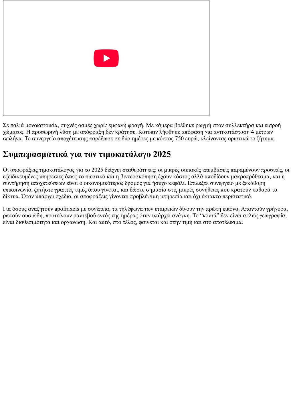 Σε παλιά μονοκατοικία, συχνές οσμές χωρίς εμφανή φραγή. Με κάμερα βρέθηκε ρωγμή στον συλλεκτήρα και εισροή χώματος. Η προσωρινή λύση με απόφραξη δεν κράτησε. Κατόπιν λήφθηκε απόφαση για αντικατάσταση 4 μέτρων σωλήνα. Το συνεργείο αποχέτευσης παρέδωσε σε δύο ημέρες με κόστος 750 ευρώ, κλείνοντας οριστικά το ζήτημα. Συμπερασματικά για τον τιμοκατάλογο 2025 Οι αποφράξεις τιμοκατάλογος για το 2025 δείχνει σταθερότητες: οι μικρές οικιακές επεμβάσεις παραμένουν προσιτές, οι εξειδικευμένες υπηρεσίες όπως το πιεστικό και η βιντεοσκόπηση έχουν κόστος αλλά αποδίδουν μακροπρόθεσμα, και η συντήρηση αποχετεύσεων είναι ο οικονομικότερος δρόμος για ήσυχο κεφάλι. Επιλέξτε συνεργείο με ξεκάθαρη επικοινωνία, ζητήστε γραπτές τιμές όπου γίνεται, και δώστε σημασία στις μικρές συνήθειες που κρατούν καθαρά τα δίκτυα. Όταν υπάρχει σχέδιο, οι αποφράξεις γίνονται προβλέψιμη υπηρεσία και όχι έκτακτο περιστατικό. Για όσους αναζητούν apofraxeis με συνέπεια, τα τηλέφωνα των εταιρειών δίνουν την πρώτη εικόνα. Απαντούν γρήγορα, ρωτούν ουσιώδη, προτείνουν ραντεβού εντός της ημέρας όταν υπάρχει ανάγκη. Το “κοντά” δεν είναι απλώς γεωγραφία, είναι διαθεσιμότητα και οργάνωση. Και αυτό, στο τέλος, φαίνεται και στην τιμή και στο αποτέλεσμα.