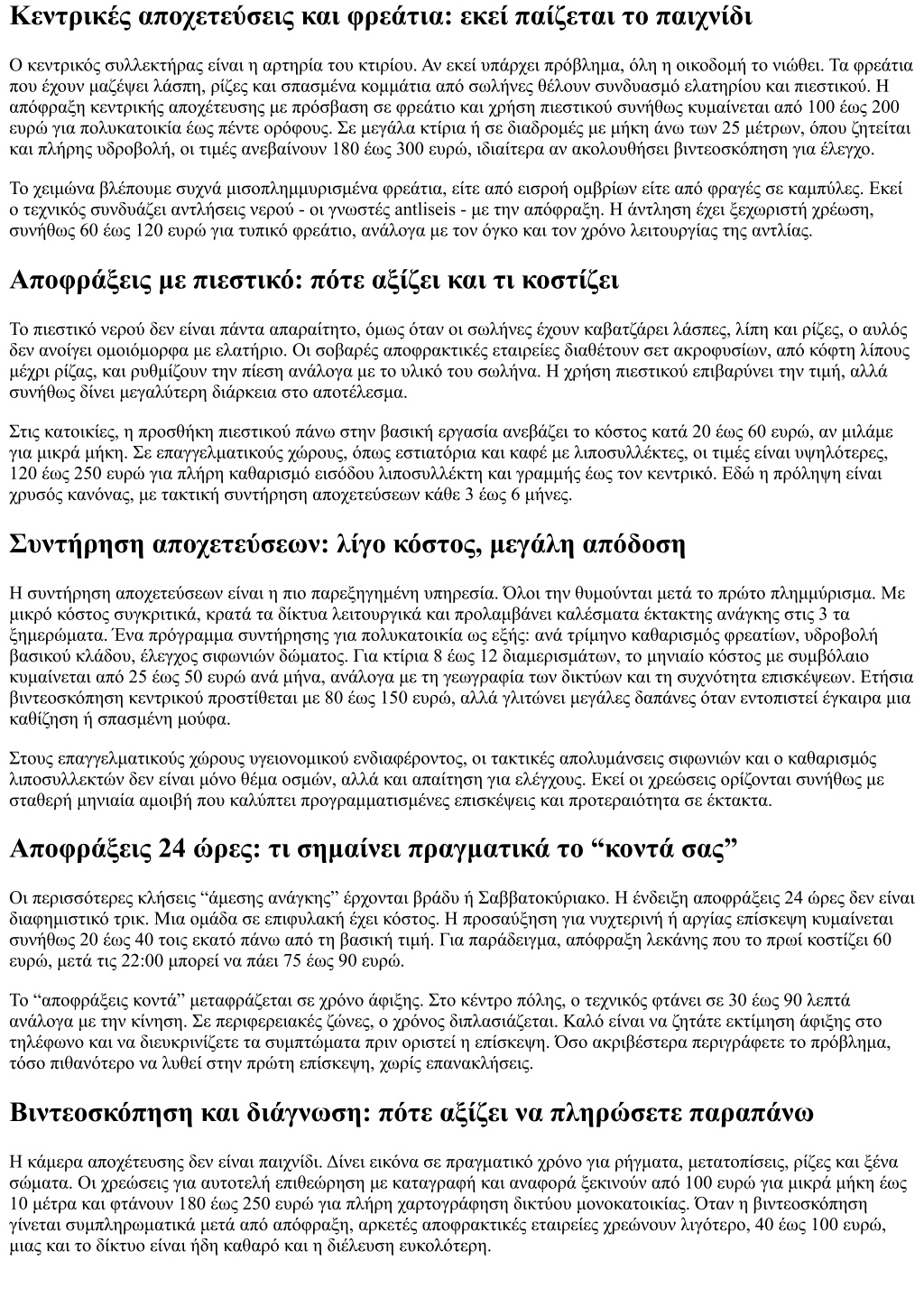 Κεντρικές αποχετεύσεις και φρεάτια: εκεί παίζεται το παιχνίδι Ο κεντρικός συλλεκτήρας είναι η αρτηρία του κτιρίου. Αν εκεί υπάρχει πρόβλημα, όλη η οικοδομή το νιώθει. Τα φρεάτια που έχουν μαζέψει λάσπη, ρίζες και σπασμένα κομμάτια από σωλήνες θέλουν συνδυασμό ελατηρίου και πιεστικού. Η απόφραξη κεντρικής αποχέτευσης με πρόσβαση σε φρεάτιο και χρήση πιεστικού συνήθως κυμαίνεται από 100 έως 200 ευρώ για πολυκατοικία έως πέντε ορόφους. Σε μεγάλα κτίρια ή σε διαδρομές με μήκη άνω των 25 μέτρων, όπου ζητείται και πλήρης υδροβολή, οι τιμές ανεβαίνουν 180 έως 300 ευρώ, ιδιαίτερα αν ακολουθήσει βιντεοσκόπηση για έλεγχο. Το χειμώνα βλέπουμε συχνά μισοπλημμυρισμένα φρεάτια, είτε από εισροή ομβρίων είτε από φραγές σε καμπύλες. Εκεί ο τεχνικός συνδυάζει αντλήσεις νερού - οι γνωστές antliseis - με την απόφραξη. Η άντληση έχει ξεχωριστή χρέωση, συνήθως 60 έως 120 ευρώ για τυπικό φρεάτιο, ανάλογα με τον όγκο και τον χρόνο λειτουργίας της αντλίας. Αποφράξεις με πιεστικό: πότε αξίζει και τι κοστίζει Το πιεστικό νερού δεν είναι πάντα απαραίτητο, όμως όταν οι σωλήνες έχουν καβατζάρει λάσπες, λίπη και ρίζες, ο αυλός δεν ανοίγει ομοιόμορφα με ελατήριο. Οι σοβαρές αποφρακτικές εταιρείες διαθέτουν σετ ακροφυσίων, από κόφτη λίπους μέχρι ρίζας, και ρυθμίζουν την πίεση ανάλογα με το υλικό του σωλήνα. Η χρήση πιεστικού επιβαρύνει την τιμή, αλλά συνήθως δίνει μεγαλύτερη διάρκεια στο αποτέλεσμα. Στις κατοικίες, η προσθήκη πιεστικού πάνω στην βασική εργασία ανεβάζει το κόστος κατά 20 έως 60 ευρώ, αν μιλάμε για μικρά μήκη. Σε επαγγελματικούς χώρους, όπως εστιατόρια και καφέ με λιποσυλλέκτες, οι τιμές είναι υψηλότερες, 120 έως 250 ευρώ για πλήρη καθαρισμό εισόδου λιποσυλλέκτη και γραμμής έως τον κεντρικό. Εδώ η πρόληψη είναι χρυσός κανόνας, με τακτική συντήρηση αποχετεύσεων κάθε 3 έως 6 μήνες. Συντήρηση αποχετεύσεων: λίγο κόστος, μεγάλη απόδοση Η συντήρηση αποχετεύσεων είναι η πιο παρεξηγημένη υπηρεσία. Όλοι την θυμούνται μετά το πρώτο πλημμύρισμα. Με μικρό κόστος συγκριτικά, κρατά τα δίκτυα λειτουργικά και προλαμβάνει καλέσματα έκτακτης ανάγκης στις 3 τα ξημερώματα. Ένα πρόγραμμα συντήρησης για πολυκατοικία ως εξής: ανά τρίμηνο καθαρισμός φρεατίων, υδροβολή βασικού κλάδου, έλεγχος σιφωνιών δώματος. Για κτίρια 8 έως 12 διαμερισμάτων, το μηνιαίο κόστος με συμβόλαιο κυμαίνεται από 25 έως 50 ευρώ ανά μήνα, ανάλογα με τη γεωγραφία των δικτύων και τη συχνότητα επισκέψεων. Ετήσια βιντεοσκόπηση κεντρικού προστίθεται με 80 έως 150 ευρώ, αλλά γλιτώνει μεγάλες δαπάνες όταν εντοπιστεί έγκαιρα μια καθίζηση ή σπασμένη μούφα. Στους επαγγελματικούς χώρους υγειονομικού ενδιαφέροντος, οι τακτικές απολυμάνσεις σιφωνιών και ο καθαρισμός λιποσυλλεκτών δεν είναι μόνο θέμα οσμών, αλλά και απαίτηση για ελέγχους. Εκεί οι χρεώσεις ορίζονται συνήθως με σταθερή μηνιαία αμοιβή που καλύπτει προγραμματισμένες επισκέψεις και προτεραιότητα σε έκτακτα. Αποφράξεις 24 ώρες: τι σημαίνει πραγματικά το “κοντά σας” Οι περισσότερες κλήσεις “άμεσης ανάγκης” έρχονται βράδυ ή Σαββατοκύριακο. Η ένδειξη αποφράξεις 24 ώρες δεν είναι διαφημιστικό τρικ. Μια ομάδα σε επιφυλακή έχει κόστος. Η προσαύξηση για νυχτερινή ή αργίας επίσκεψη κυμαίνεται συνήθως 20 έως 40 τοις εκατό πάνω από τη βασική τιμή. Για παράδειγμα, απόφραξη λεκάνης που το πρωί κοστίζει 60 ευρώ, μετά τις 22:00 μπορεί να πάει 75 έως 90 ευρώ. Το “αποφράξεις κοντά” μεταφρά