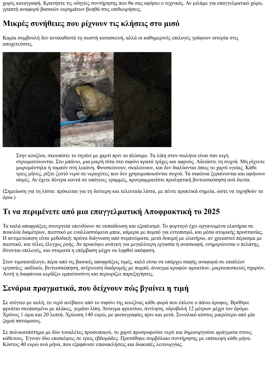 χωρίς καταγραφή. Κρατήστε τις οδηγίες συντήρησης που θα σας αφήσει ο τεχνικός. Αν μιλάμε για επαγγελματικό χώρο, γραπτή αναφορά βασικών ευρημάτων βοηθά στις επιθεωρήσεις. Μικρές συνήθειες που ρίχνουν τις κλήσεις στο μισό Καμία συμβουλή δεν αντικαθιστά τη σωστή κατασκευή, αλλά οι καθημερινές επιλογές γράφουν ιστορία στις αποχετεύσεις. Στην κουζίνα, σκουπίστε το τηγάνι με χαρτί πριν το πλύσιμο. Τα λίπη στον σωλήνα είναι σαν κερί, στρωματώνονται. Στο μπάνιο, μια μικρή σίτα στο σιφόνι κρατά τρίχες και αφρούς. Αδειάστε τη συχνά. Μη ρίχνετε μωρομάντηλα ή ταμπόν στη λεκάνη. Φουσκώνουν, σκαλώνουν, και δεν διαλύονται όπως το χαρτί υγείας. Κάθε τρεις μήνες, ρίξτε ζεστό νερό σε νεροχύτες που δεν χρησιμοποιούνται συχνά. Τα σιφώνια ξεραίνονται και αφήνουν οσμές. Αν έχετε δέντρα κοντά σε υπόγειες γραμμές, προγραμματίστε προληπτική βιντεοσκόπηση ανά διετία. (Σημείωση για τη λίστα: πρόκειται για τη δεύτερη και τελευταία λίστα, με πέντε πρακτικά σημεία, ώστε να τηρηθούν τα όρια.) Τι να περιμένετε από μια επαγγελματική Αποφρακτική το 2025 Τα καλά αποφράξεις συνεργεία επενδύουν σε εκπαίδευση και εξοπλισμό. Το φορτηγό έχει οργανωμένα ελατήρια σε ποικιλία διαμέτρων, πιεστικό με εναλλασσόμενα μπεκ, κάμερα με πομπό για εντοπισμό, και μέσα ατομικής προστασίας. Η αντιμετώπιση είναι μεθοδική: πρώτα διάγνωση από συμπτώματα, μετά δοκιμή με ελατήριο, αν χρειαστεί πέρασμα με πιεστικό, και τέλος έλεγχος ροής. Αν προκύψει ανάγκη για μεγαλύτερη εργασία ή ανασκαφή, ενημερώνεται ο πελάτης, δίνονται επιλογές, και σταματά η επέμβαση μέχρι να ληφθεί απόφαση. Στον τιμοκατάλογο, πέρα από τις βασικές αποφράξεις τιμές, καλό είναι να υπάρχει σαφής αναφορά σε επιπλέον εργασίες: antliseis, βιντεοσκόπηση, ανίχνευση διαδρομής με πομπό, άνοιγμα κρυφών φρεατίων, μικροεπισκευές σχαρών. Αυτή η διαφάνεια κερδίζει εμπιστοσύνη και περιορίζει παρεξηγήσεις. Σενάρια πραγματικά, που δείχνουν πώς βγαίνει η τιμή Σε ισόγειο με αυλή, το νερό ανέβαινε από το σιφόνι της κουζίνας κάθε φορά που έπλενε ο πάνω όροφος. Βρέθηκε φρεάτιο σκεπασμένο με πλάκες, γεμάτο λίπη. Άνοιγμα φρεατίου, άντληση, υδροβολή 12 μέτρων μέχρι τον δρόμο. Χρόνος 1 ώρα και 20 λεπτά. Χρέωση 140 ευρώ, με φωτογραφίες πριν και μετά. Συνολικό κόστος μικρότερο από μία ζημιά πατώματος. Σε πολυκατάστημα με δύο τουαλέτες προσωπικού, το χαρτί προσροφούσε νερό και δημιουργούσε φράγματα στους κάθετους. Έγιναν δύο επισκέψεις σε τρεις εβδομάδες. Προτάθηκε συμβόλαιο συντήρησης με επίσκεψη κάθε μήνα. Κόστος 40 ευρώ ανά μήνα, που εξαφάνισε επανακλήσεις και διακοπές λειτουργίας.