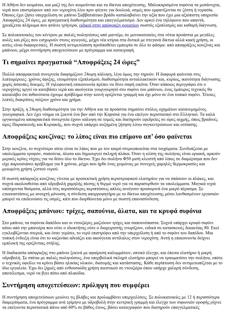 Η Αθήνα δεν κοιμάται, και μαζί της δεν κοιμούνται και τα δίκτυα αποχέτευσης. Μπλοκαρισμένα σιφόνια τα μεσάνυχτα, νερά που επιστρέφουν από τον νεροχύτη λίγο πριν φύγετε για δουλειά, οσμές που εμφανίζονται σε ζέστη ή υγρασία. Όποιος έχει ζήσει υπερχείλιση σε μπάνιο Σαββατιάτικο βράδυ καταλαβαίνει την αξία που έχει μια αξιόπιστη υπηρεσία Αποφράξεις 24 ώρες, με πραγματική διαθεσιμότητα και επαγγελματισμό. Δεν αρκεί ένα τηλέφωνο που απαντά, χρειάζεται πλήρωμα που φτάνει γρήγορα, ειδικοί στην απόφραξη φρεατίων σωστός εξοπλισμός και καθαρή διάγνωση. Σε πολυκατοικίες του κέντρου με παλιές σωληνώσεις από μαντέμι, σε μονοκατοικίες στα νότια προάστια με μεγάλες αυλές και ρίζες που εισχωρούν στους αγωγούς, μέχρι νέα κτίρια στα δυτικά με στεγανά δίκτυα αλλά κακή χρήση, οι αιτίες είναι διαφορετικές. Η σωστή αντιμετώπιση προϋποθέτει εμπειρία σε όλο το φάσμα: από αποφράξεις κουζίνας και μπάνιου, μέχρι συντήρηση αποχετεύσεων με πρόγραμμα και καταγραφή. Τι σημαίνει πραγματικά “Αποφράξεις 24 ώρες” Πολλά αποφρακτικά συνεργεία διαφημίζουν 24ωρη κάλυψη, λίγα όμως την τηρούν. Η διαφορά φαίνεται στις λεπτομέρειες: χρόνος άφιξης, ετοιμότητα εξοπλισμού, διαθεσιμότητα ανταλλακτικών και, κυρίως, ικανότητα διάγνωσης χωρίς άσκοπες δοκιμές. Η τηλεφωνική επικοινωνία πρέπει να δίνει σαφή εικόνα. Όταν κάποιος περιγράφει ότι ο νεροχύτης αργεί να κατεβάσει νερά και ακούγεται γουργουρητό στο σιφόνι του μπάνιου, ένας έμπειρος τεχνικός θα καταλάβει ότι πιθανότατα έχουμε πρόβλημα στην κοινή οριζόντια γραμμή και όχι μόνο σε ένα τοπικό σιφόνι. Τέτοιες λεπτές διακρίσεις σώζουν χρόνο και χρήμα. Στην πράξη, η 24ωρη διαθεσιμότητα για την Αθήνα και τα προάστια σημαίνει στόλος οχημάτων κατανεμημένος γεωγραφικά. Δεν έχει νόημα να ξεκινά ένα βαν από την Κηφισιά για ένα επείγον περιστατικό στο Ελληνικό. Τα καλά οργανωμένα αποφρακτικά συνεργεία έχουν κάλυψη σε τομείς και διατηρούν εφεδρείες σε ώρες αιχμής, όπως βραδινές ώρες Παρασκευής και Κυριακής, που συχνά υπάρχει αυξημένη ζήτηση λόγω συγκεντρώσεων και εστίασης. Αποφράξεις κουζίνας: το λίπος είναι πιο επίμονο απ’ όσο φαίνεται Στην κουζίνα, το συχνότερο αίτιο είναι το λίπος που με τον καιρό στερεοποιείται στα τοιχώματα. Συνδυάζεται με υπολείμματα τροφών, σαπούνια, άλατα και δημιουργεί σκληρή πλάκα. Όταν η κλίση της σωλήνας είναι οριακή, αρκούν μερικές κρύες νύχτες για να δέσει όλο το δίκτυο. Έχω δει σωλήνα Φ50 μισή κλειστή από λίπος σε διαμέρισμα που δεν είχε παρουσιάσει πρόβλημα για 8 χρόνια, μέχρι που ήρθε ένας χειμώνας με συνεχείς χαμηλές θερμοκρασίες και μειωμένη χρήση ζεστού νερού. Η σωστή απόφραξη κουζίνας γίνεται με προσεκτική χρήση περιστροφικού ελατηρίου για να σπάσουν οι πλάκες, και συχνά ακολουθείται από υδροβολή χαμηλής πίεσης ή θερμό νερό για να παρασυρθούν τα υπολείμματα. Μαγικά υγρά υπόσχονται θαύματα, αλλά στις περισσότερες περιπτώσεις απλώς ανοίγουν προσωρινά ένα μικρό πέρασμα. Σε εγκαταστάσεις με ανοιχτή μόνωση, η σύνδεση απορροφητήρα με το δίκτυο αποχέτευσης μέσω λανθασμένων εργασιών μπορεί να επιδεινώσει τις οσμές, κάτι που διορθώνεται μόνο με σωστή επανασύνδεση. Αποφράξεις μπάνιου: τρίχες, σαπούνια, άλατα, και τα κρυφά σιφόνια Στο μπάνιο, τα σιφόνια δαπέδου και οι ντουζιέρες μαζεύουν τρίχες και σαπουνόπαστα. Συχνά υπάρχει κρυφό σιφόνι κάτω από την μπανιέρα που ούτε ο ιδιοκτήτης ούτε ο διαχε