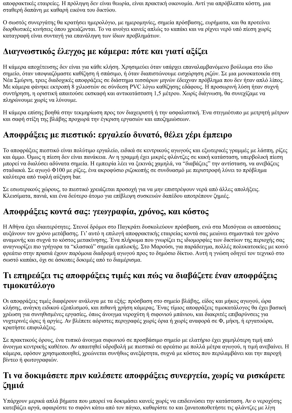 αποφρακτικές εταιρείες. Η πρόληψη δεν είναι θεωρία, είναι πρακτική οικονομία. Αντί για απρόβλεπτα κόστη, μια σταθερή δαπάνη με καθαρή εικόνα του δικτύου. Ο σωστός συνεργάτης θα κρατήσει ημερολόγιο, με ημερομηνίες, σημεία πρόσβασης, ευρήματα, και θα προτείνει διορθωτικές κινήσεις όπου χρειάζονται. Το να ανοίγει κανείς απλώς το καπάκι και να ρίχνει νερό υπό πίεση χωρίς καταγραφή είναι συνταγή για επανάληψη των ίδιων προβλημάτων. Διαγνωστικός έλεγχος με κάμερα: πότε και γιατί αξίζει Η κάμερα αποχέτευσης δεν είναι για κάθε κλήση. Χρησιμεύει όταν υπάρχει επαναλαμβανόμενο βούλωμα στο ίδιο σημείο, όταν υποψιαζόμαστε καθίζηση ή σπάσιμο, ή όταν διαπιστώνουμε εισχώρηση ριζών. Σε μια μονοκατοικία στη Νέα Σμύρνη, τρεις διαδοχικές αποφράξεις σε διάστημα τεσσάρων μηνών έδειχναν πρόβλημα που δεν ήταν απλό λίπος. Με κάμερα φάνηκε εκτροπή 8 χιλιοστών σε σύνδεση PVC λόγω καθίζησης εδάφους. Η προσωρινή λύση ήταν συχνή συντήρηση, η οριστική απαιτούσε εκσκαφή και αντικατάσταση 1,5 μέτρου. Χωρίς διάγνωση, θα συνεχίζαμε να πληρώνουμε χωρίς να λύνουμε. Η κάμερα επίσης βοηθά στην τεκμηρίωση προς τον διαχειριστή ή την ασφαλιστική. Ένα στιγμιότυπο με μετρητή μέτρων και σαφή στίξη της βλάβης προχωρά την έγκριση εργασιών και αποζημιώσεων. Αποφράξεις με πιεστικό: εργαλείο δυνατό, θέλει χέρι έμπειρο Το αποφράξεις πιεστικό είναι πολύτιμο εργαλείο, ειδικά σε κεντρικούς αγωγούς και εξωτερικές γραμμές με λάσπη, ρίζες και άμμο. Όμως η πίεση δεν είναι πανάκεια. Αν η γραμμή έχει μικρές φλάντζες σε κακή κατάσταση, υπερβολική πίεση μπορεί να διαλύσει αδύνατα σημεία. Η εμπειρία λέει να ξεκινάς χαμηλά, να “διαβάζεις” την αντίσταση, να ανεβάζεις σταδιακά. Σε αγωγό Φ100 με ρίζες, ένα ακροφύσιο ριζοκοπής σε συνδυασμό με περιστροφή λύνει το πρόβλημα καλύτερα από τυφλή αύξηση bar. Σε εσωτερικούς χώρους, το πιεστικό χρειάζεται προσοχή για να μην επιστρέψουν νερά από άλλες απολήξεις. Κλεισίματα, πανιά, και ένα δεύτερο άτομο για επίβλεψη συσκευών δαπέδου αποτρέπουν ζημιές. Αποφράξεις κοντά σας: γεωγραφία, χρόνος, και κόστος Η Αθήνα έχει ιδιαιτερότητες. Στενοί δρόμοι στο Παγκράτι δυσκολεύουν πρόσβαση, ενώ στα Μεσόγεια οι αποστάσεις αυξάνουν τον χρόνο μετάβασης. Γι’ αυτό η επιλογή αποφρακτικής εταιρείας κοντά σας μειώνει σημαντικά τον χρόνο αναμονής και συχνά το κόστος μετακίνησης. Ένα πλήρωμα που γνωρίζει τις ιδιομορφίες των δικτύων της περιοχής σας αναγνωρίζει πιο γρήγορα τα “κλασικά” σημεία εμπλοκής. Στο Μαρούσι, για παράδειγμα, πολλές πολυκατοικίες με κοινό φρεάτιο στην πρασιά έχουν παρόμοια διαδρομή αγωγού προς το δημόσιο δίκτυο. Αυτή η γνώση οδηγεί τον τεχνικό στο σωστό καπάκι, όχι σε άσκοπες δοκιμές από το διαμέρισμα. Τι επηρεάζει τις αποφράξεις τιμές και πώς να διαβάζετε έναν αποφράξεις τιμοκατάλογο Οι αποφράξεις τιμές διαφέρουν ανάλογα με τα εξής: πρόσβαση στο σημείο βλάβης, είδος και μήκος αγωγού, ώρα κλήσης, ανάγκη ειδικού εξοπλισμού, και πιθανή χρήση κάμερας. Ένας τίμιος αποφράξεις τιμοκατάλογος θα έχει βασική χρέωση για συνηθισμένες εργασίες, όπως άνοιγμα νεροχύτη ή σιφονιού μπάνιου, και διακριτές επιβαρύνσεις για νυχτερινές ώρες ή αργίες. Αν βλέπετε αόριστες περιγραφές χωρίς όρια ή χωρίς αναφορά σε Φ, μήκη, ή εργατοώρα, κρατήστε επιφυλάξεις. Σε πρακτικούς όρους, ένα τυπικό άνοιγμα σιφωνιού σε προσβάσιμο σημείο με ελατήριο έχει χαμηλότερη τιμή από άνοιγμα κ