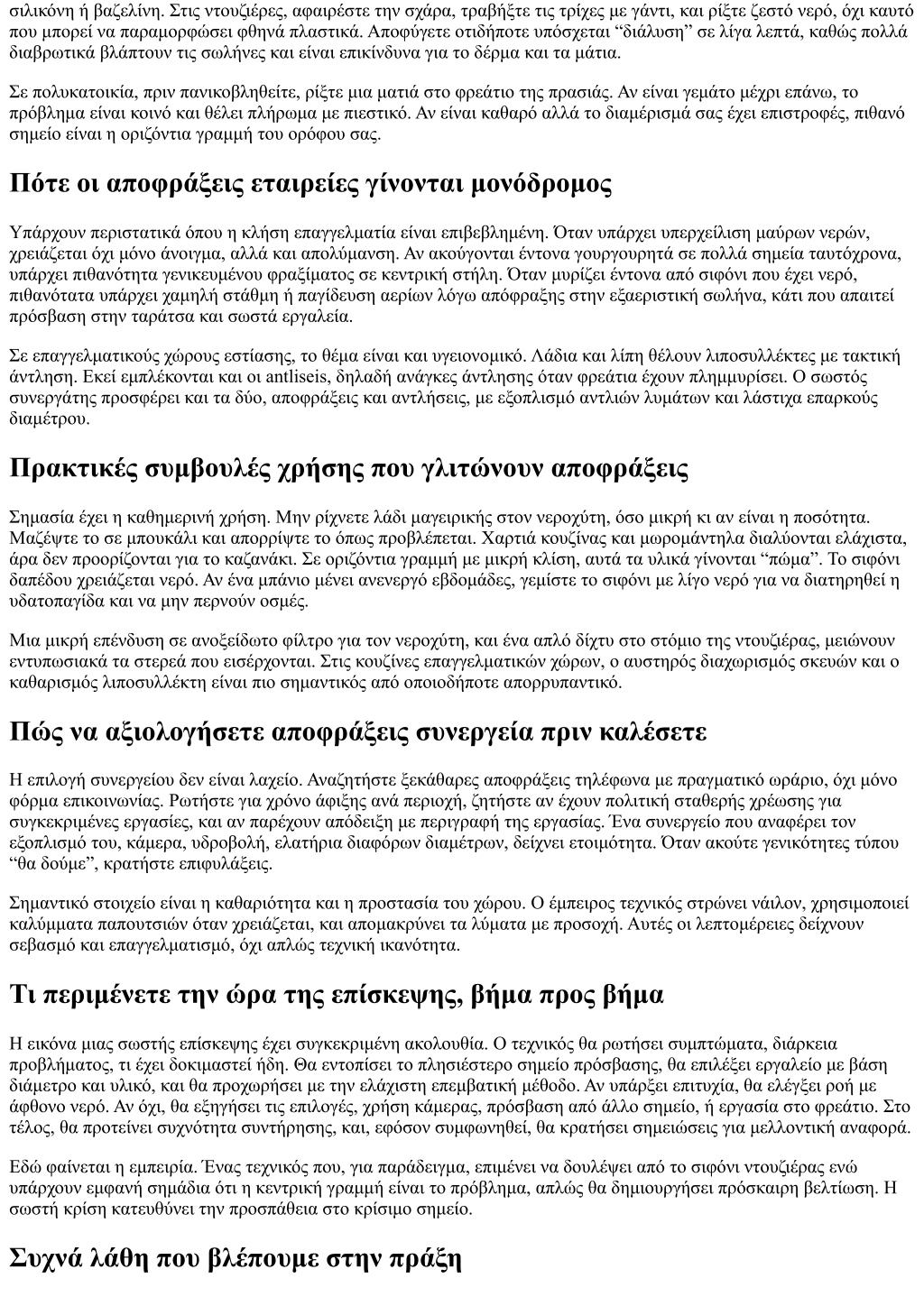 σιλικόνη ή βαζελίνη. Στις ντουζιέρες, αφαιρέστε την σχάρα, τραβήξτε τις τρίχες με γάντι, και ρίξτε ζεστό νερό, όχι καυτό που μπορεί να παραμορφώσει φθηνά πλαστικά. Αποφύγετε οτιδήποτε υπόσχεται “διάλυση” σε λίγα λεπτά, καθώς πολλά διαβρωτικά βλάπτουν τις σωλήνες και είναι επικίνδυνα για το δέρμα και τα μάτια. Σε πολυκατοικία, πριν πανικοβληθείτε, ρίξτε μια ματιά στο φρεάτιο της πρασιάς. Αν είναι γεμάτο μέχρι επάνω, το πρόβλημα είναι κοινό και θέλει πλήρωμα με πιεστικό. Αν είναι καθαρό αλλά το διαμέρισμά σας έχει επιστροφές, πιθανό σημείο είναι η οριζόντια γραμμή του ορόφου σας. Πότε οι αποφράξεις εταιρείες γίνονται μονόδρομος Υπάρχουν περιστατικά όπου η κλήση επαγγελματία είναι επιβεβλημένη. Όταν υπάρχει υπερχείλιση μαύρων νερών, χρειάζεται όχι μόνο άνοιγμα, αλλά και απολύμανση. Αν ακούγονται έντονα γουργουρητά σε πολλά σημεία ταυτόχρονα, υπάρχει πιθανότητα γενικευμένου φραξίματος σε κεντρική στήλη. Όταν μυρίζει έντονα από σιφόνι που έχει νερό, πιθανότατα υπάρχει χαμηλή στάθμη ή παγίδευση αερίων λόγω απόφραξης στην εξαεριστική σωλήνα, κάτι που απαιτεί πρόσβαση στην ταράτσα και σωστά εργαλεία. Σε επαγγελματικούς χώρους εστίασης, το θέμα είναι και υγειονομικό. Λάδια και λίπη θέλουν λιποσυλλέκτες με τακτική άντληση. Εκεί εμπλέκονται και οι antliseis, δηλαδή ανάγκες άντλησης όταν φρεάτια έχουν πλημμυρίσει. Ο σωστός συνεργάτης προσφέρει και τα δύο, αποφράξεις και αντλήσεις, με εξοπλισμό αντλιών λυμάτων και λάστιχα επαρκούς διαμέτρου. Πρακτικές συμβουλές χρήσης που γλιτώνουν αποφράξεις Σημασία έχει η καθημερινή χρήση. Μην ρίχνετε λάδι μαγειρικής στον νεροχύτη, όσο μικρή κι αν είναι η ποσότητα. Μαζέψτε το σε μπουκάλι και απορρίψτε το όπως προβλέπεται. Χαρτιά κουζίνας και μωρομάντηλα διαλύονται ελάχιστα, άρα δεν προορίζονται για το καζανάκι. Σε οριζόντια γραμμή με μικρή κλίση, αυτά τα υλικά γίνονται “πώμα”. Το σιφόνι δαπέδου χρειάζεται νερό. Αν ένα μπάνιο μένει ανενεργό εβδομάδες, γεμίστε το σιφόνι με λίγο νερό για να διατηρηθεί η υδατοπαγίδα και να μην περνούν οσμές. Μια μικρή επένδυση σε ανοξείδωτο φίλτρο για τον νεροχύτη, και ένα απλό δίχτυ στο στόμιο της ντουζιέρας, μειώνουν εντυπωσιακά τα στερεά που εισέρχονται. Στις κουζίνες επαγγελματικών χώρων, ο αυστηρός διαχωρισμός σκευών και ο καθαρισμός λιποσυλλέκτη είναι πιο σημαντικός από οποιοδήποτε απορρυπαντικό. Πώς να αξιολογήσετε αποφράξεις συνεργεία πριν καλέσετε Η επιλογή συνεργείου δεν είναι λαχείο. Αναζητήστε ξεκάθαρες αποφράξεις τηλέφωνα με πραγματικό ωράριο, όχι μόνο φόρμα επικοινωνίας. Ρωτήστε για χρόνο άφιξης ανά περιοχή, ζητήστε αν έχουν πολιτική σταθερής χρέωσης για συγκεκριμένες εργασίες, και αν παρέχουν απόδειξη με περιγραφή της εργασίας. Ένα συνεργείο που αναφέρει τον εξοπλισμό του, κάμερα, υδροβολή, ελατήρια διαφόρων διαμέτρων, δείχνει ετοιμότητα. Όταν ακούτε γενικότητες τύπου “θα δούμε”, κρατήστε επιφυλάξεις. Σημαντικό στοιχείο είναι η καθαριότητα και η προστασία του χώρου. Ο έμπειρος τεχνικός στρώνει νάιλον, χρησιμοποιεί καλύμματα παπουτσιών όταν χρειάζεται, και απομακρύνει τα λύματα με προσοχή. Αυτές οι λεπτομέρειες δείχνουν σεβασμό και επαγγελματισμό, όχι απλώς τεχνική ικανότητα. Τι περιμένετε την ώρα της επίσκεψης, βήμα προς βήμα Η εικόνα μιας σωστής επίσκεψης έχει συγκεκριμένη ακολουθία. Ο τεχνικός θα ρωτήσει συμπτώματα, διάρκεια προβλήματος, τ