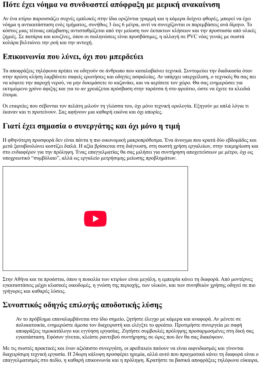 Πότε έχει νόημα να συνδυαστεί απόφραξη με μερική ανακαίνιση Αν ένα κτίριο παρουσιάζει συχνές εμπλοκές στην ίδια οριζόντια γραμμή και η κάμερα δείχνει φθορές, μπορεί να έχει νόημα η αντικατάσταση ενός τμήματος, συνήθως 3 έως 6 μέτρα, αντί να συνεχίζονται οι παρεμβάσεις ανά δίμηνο. Το κόστος μιας τέτοιας επέμβασης αντισταθμίζεται από την μείωση των έκτακτων κλήσεων και την προστασία από υλικές ζημιές. Σε πατάρια και κουζίνες, όπου οι σωληνώσεις είναι προσβάσιμες, η αλλαγή σε PVC νέας γενιάς με σωστά κολάρα βελτιώνει την ροή και την αντοχή. Επικοινωνία που λύνει, όχι που μπερδεύει Τα αποφράξεις τηλέφωνα πρέπει να οδηγούν σε άνθρωπο που καταλαβαίνει τεχνικά. Συντομεύει την διαδικασία όταν στην πρώτη κλήση λαμβάνετε σαφείς ερωτήσεις και οδηγίες ασφαλείας. Αν υπάρχει υπερχείλιση, ο τεχνικός θα σας πει να κόψετε την παροχή νερού, να μην δοκιμάσετε το καζανάκι, και να αερίσετε τον χώρο. Θα σας ενημερώσει για εκτιμώμενο χρόνο άφιξης και για το αν χρειάζεται πρόσβαση στην ταράτσα ή στο φρεάτιο, ώστε να έχετε τα κλειδιά έτοιμα. Οι εταιρείες που σέβονται τον πελάτη μιλούν τη γλώσσα του, όχι μόνο τεχνική ορολογία. Εξηγούν με απλά λόγια τι έκαναν και τι προτείνουν. Σας αφήνουν μια καθαρή εικόνα και όχι απορίες. Γιατί έχει σημασία ο συνεργάτης και όχι μόνο η τιμή Η φθηνότερη προσφορά δεν είναι πάντα η πιο οικονομική μακροπρόθεσμα. Ένα άνοιγμα που κρατά δύο εβδομάδες και μετά ξαναβουλώνει κοστίζει διπλά. Η αξία βρίσκεται στη διάγνωση, στη σωστή χρήση εργαλείων, στην τεκμηρίωση και στο ενδιαφέρον για την πρόληψη. Ένας επαγγελματίας θα σας μιλήσει για συντήρηση αποχετεύσεων με μέτρο, όχι ως υποχρεωτικό “συμβόλαιο”, αλλά ως εργαλείο μετρήσιμης μείωσης προβλημάτων. Στην Αθήνα και τα προάστια, όπου η ποικιλία των κτιρίων είναι μεγάλη, η εμπειρία κάνει τη διαφορά. Από μοντέρνες εγκαταστάσεις μέχρι κλασικές οικοδομές, η γνώση της περιοχής, των υλικών, και των συνηθειών χρήσης οδηγεί σε πιο γρήγορες και καθαρές λύσεις. Συνοπτικός οδηγός επιλογής αποδοτικής λύσης Αν το πρόβλημα επαναλαμβάνεται στο ίδιο σημείο, ζητήστε έλεγχο με κάμερα και αναφορά. Αν μένετε σε πολυκατοικία, ενημερώστε άμεσα τον διαχειριστή και ελέγξτε το φρεάτιο. Προτιμήστε συνεργεία με σαφή αποφράξεις τιμοκατάλογο και εγγύηση εργασίας. Ζητήστε συμβουλές πρόληψης προσαρμοσμένες στη δική σας εγκατάσταση. Εφόσον γίνεται, κλείστε ραντεβού συντήρησης σε ώρες που δεν θα σας διακόψουν. Με τις σωστές πρακτικές και έναν αξιόπιστο συνεργάτη, οι apofraxeis παύουν να είναι αιφνιδιασμός και γίνονται διαχειρίσιμη τεχνική εργασία. Η 24ωρη κάλυψη προσφέρει ηρεμία, αλλά αυτό που πραγματικά κάνει τη διαφορά είναι ο επαγγελματισμός στο πεδίο, η καθαρή επικοινωνία και η πρόληψη. Κρατήστε τα βασικά αποφράξεις τηλέφωνα εύκαιρα,