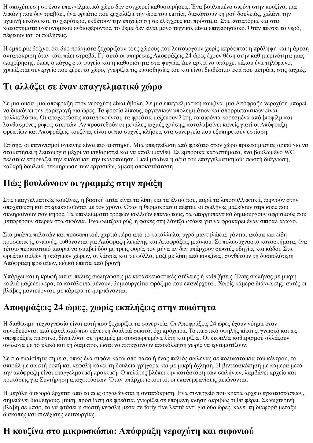 Η αποχέτευση σε έναν επαγγελματικό χώρο δεν συγχωρεί καθυστερήσεις. Ένα βουλωμένο σιφόνι στην κουζίνα, μια λεκάνη που δεν τραβάει, ένα φρεάτιο που ξεχειλίζει την ώρα του carrier, διακόπτουν τη ροή δουλειάς, χαλάνε την υγιεινή εικόνα και, το χειρότερο, εκθέτουν την επιχείρηση σε ελέγχους και πρόστιμα. Στα εστιατόρια και στα καταστήματα υγειονομικού ενδιαφέροντος, το θέμα δεν είναι μόνο τεχνικό, είναι επιχειρησιακό. Όταν πέφτει το νερό, πέφτουν και οι πωλήσεις. Η εμπειρία δείχνει ότι δύο πράγματα ξεχωρίζουν τους χώρους που λειτουργούν χωρίς απρόοπτα: η πρόληψη και η άμεση ανταπόκριση όταν κάτι πάει στραβά. Γι’ αυτό οι υπηρεσίες Αποφράξεις 24 ώρες έχουν θέση στην καθημερινότητα μιας επιχείρησης, όπως ο πάγος στα ψυγεία και η καθαριότητα στα ψυγεία. Δεν αρκεί να υπάρχει κάπου ένα τηλέφωνο, χρειάζεται συνεργείο που ξέρει το χώρο, γνωρίζει τις ευαισθησίες του και είναι διαθέσιμο εκεί που μετράει, στις αιχμές. Τι αλλάζει σε έναν επαγγελματικό χώρο Σε μια οικία, μια απόφραξη στον νεροχύτη είναι άβολη. Σε μια επαγγελματική κουζίνα, μια Απόφραξη νεροχύτη μπορεί να διακόψει την παραγωγή για ώρες. Τα φορτία λίπους, οργανικών υπολειμμάτων και απορρυπαντικών είναι πολλαπλάσια. Οι αποχετεύσεις καταπονούνται, τα φρεάτια μαζεύουν λίπη, τα σιφόνια κορεσμένα από βιοφίλμ και λανθασμένες ρίψεις στερεών. Αν προστεθούν οι μεγάλες αιχμές χρήσης, καταλαβαίνει κανείς γιατί οι Απόφραξη φρεατίων και Αποφράξεις κουζίνας είναι οι πιο συχνές κλήσεις στα συνεργεία που εξυπηρετούν εστίαση. Επίσης, οι κανονισμοί υγιεινής είναι πιο αυστηροί. Μια υπερχείλιση από φρεάτιο στον χώρο προετοιμασίας αρκεί για να σταματήσει η λειτουργία μέχρι να καθαριστεί και να απολυμανθεί. Σε εμπορικά καταστήματα, ένα βουλωμένο WC πελατών επηρεάζει την εικόνα και την ικανοποίηση. Εκεί μπαίνει η αξία του επαγγελματισμού: σωστή διάγνωση, καθαρή δουλειά, τεκμηρίωση των εργασιών, άμεση αποκατάσταση. Πώς βουλώνουν οι γραμμές στην πράξη Στις επαγγελματικές κουζίνες, η βασική αιτία είναι τα λίπη και τα έλαια που, παρά τα λιποσυλλεκτικά, περνούν στην αποχέτευση και στερεοποιούνται με τον χρόνο. Όταν η θερμοκρασία πέφτει, οι σωλήνες μαζεύουν στρώσεις που σκληραίνουν σαν κηρός. Τα υπολείμματα τροφών κολλούν επάνω τους, τα απορρυπαντικά δημιουργούν αφρισμούς που μεταφέρουν στερεά στα σιφόνια. Ένα φλιτζάνι ρύζι ή φακές στη λάντζα φτάνει για να φρακάρει έναν σπιράλ αγωγό. Στα μπάνια πελατών και προσωπικού, χαρτιά πέρα από το κατάλληλο, υγρά μαντηλάκια, γάντια, ακόμα και είδη προσωπικής υγιεινής, ευθύνονται για Απόφραξη λεκάνης και Αποφράξεις μπάνιου. Σε πολυσύχναστα καταστήματα, ένα τέτοιο περιστατικό μπορεί να συμβεί δύο με τρεις φορές τον μήνα αν δεν υπάρχουν σωστές οδηγίες και κάδοι. Στα φρεάτια αυλών ή υπόγειων χώρων, οι λάσπες και τα φύλλα, μαζί με λίπη από κουζίνες, συνθέτουν τη δυσκολότερη Απόφραξη φρεατίων, ειδικά έπειτα από βροχή. Υπάρχει και η κρυφή αιτία: παλιές σωληνώσεις με κατασκευαστικές ατέλειες ή καθιζήσεις. Ένας σωλήνας με μικρή κοιλιά μαζεύει νερά, τα κατάλοιπα μένουν, δημιουργείται φράξιμο που επανέρχεται. Χωρίς κάμερα διάγνωσης, αυτές οι βλάβες μαντεύονται, με κάμερα τεκμηριώνονται. Αποφράξεις 24 ώρες, χωρίς εκπλήξεις στην ποιότητα Η διαθέσιμη τεχνογνωσία είναι αυτή που ξεχωρίζει τα συνεργεία. Οι Αποφράξεις 24 ώρες έχουν νόημα όταν συνοδεύονται από εξοπλισμό που κάνει τη δ