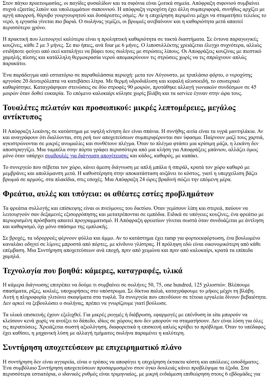 Στον πάγκο προετοιμασίας, οι παγίδες φυσαλίδων και τα σιφόνια είναι ζωτικά σημεία. Απόφραξη σιφονιού συμβαίνει συχνά εξαιτίας λιπών και υπολειμμάτων σαπουνιού. Η απόφραξη νεροχύτη έχει άλλη συμπεριφορά, συνήθως αρχίζει με αργή απορροή, θόρυβο γουργουρητού και δυσάρεστες οσμές. Αν η επιχείρηση περιμένει μέχρι να σταματήσει τελείως το νερό, η εργασία γίνεται πιο βαριά. Ο σωλήνας γεμίζει, οι βρωμιές ανεβαίνουν και η καθαριότητα μετά απαιτεί περισσότερο χρόνο. Η πρακτική που λειτουργεί καλύτερα είναι η προληπτική καθαριότητα σε τακτά διαστήματα. Σε έντονα παραγωγικές κουζίνες, κάθε 2 με 3 μήνες. Σε πιο ήπιες, ανά four με 6 μήνες. Ο λιποσυλλέκτης χρειάζεται έλεγχο συχνότερα, αλλιώς οτιδήποτε φεύγει από εκεί καταλήγει να βάφει τους σωλήνες με στρώσεις λίπους. Οι Αποφράξεις κουζίνας με πιεστικό χαμηλής πίεσης και κατάλληλη θερμοκρασία νερού απομακρύνουν τις στρώσεις χωρίς να τις σπρώχνουν απλώς παρακάτω. Ένα παράδειγμα από εστιατόριο σε παραθαλάσσια περιοχή: μετα τον Αύγουστο, με τριπλάσιο φόρτο, ο νεροχύτης αργούσε 20 δευτερόλεπτα να κατεβάσει λίτρα. Με θερμή υδροδιάλυση και κεφαλή αλυσοειδή, το εσωτερικό καθαρίστηκε. Καταγράφηκαν στενώσεις σε δύο στροφές 90 μοιρών, προτάθηκε αλλαγή γωνιακών συνδέσμων σε 45 μοιρών όταν δοθεί ευκαιρία. Το επόμενο καλοκαίρι κύλησε χωρίς βλάβη και τα service έγιναν στην ώρα τους. Τουαλέτες πελατών και προσωπικού: μικρές λεπτομέρειες, μεγάλος αντίκτυπος Η Απόφραξη λεκάνης σε κατάστημα με υψηλή κίνηση δεν είναι σπάνια. Η συνήθης αιτία είναι τα υγρά μαντηλάκια. Αν και αναγράφουν ότι διαλύονται, στη ροή των αποχετεύσεων συμπεριφέρονται σαν ύφασμα. Παίρνουν μαζί τους χαρτιά, αγκιστρώνονται σε μικρές ανωμαλίες και συνθέτουν πλέγμα. Όταν το πλέγμα φτάσει μια κρίσιμη μάζα, η λεκάνη δεν αποστραγγίζει. Μια ταμπέλα στην πόρτα γράφει περισσότερα από μια κλήση για Αποφράξεις μπάνιου, αλλάζει όμως μόνο όταν υπάρχει συμβουλές για διάγνωση αποχέτευσης και κάδος, καθαρός, με καπάκι. Το συνεργείο που σέβεται τον χώρο, κάνει άμεση διάγνωση με απλή μπάλα ή σπιράλ, κρατά τον χώρο καθαρό με μεμβράνες και απολύμανση μετά. Η καθυστέρηση στην αποκατάσταση αυξάνει το κόστος, γιατί η υπερχείλιση βάζει βρωμιά σε αρμούς, στα πλακίδια, στις εσοχές. Μια Απόφραξη 24 ώρες βραδινή σώζει την επόμενη μέρα. Φρεάτια, αυλές και υπόγεια: οι αθέατες εστίες προβλημάτων Τα φρεάτια συλλογής και επίσκεψης είναι οι πνεύμονες του δικτύου. Όταν γεμίσουν λίπη και στερεά, παύουν να λειτουργούν σαν δεξαμενές εξισορρόπησης και μετατρέπονται σε εμπόδια. Ειδικά σε υπόγειες κουζίνες, ένα φρεάτιο με περιορισμένη πρόσβαση απαιτεί προγραμματισμό. Η Απόφραξη φρεατίων γίνεται σωστά όταν συνδυάζεται με άντληση και καθαρισμό, όχι μόνο σπάσιμο της εμπλοκής. Σε βροχές, τα υδρορροές φέρνουν φύλλα και άμμο. Αν το κατάστημα έχει ramp για φορτοεκφόρτωση, ένα βουλωμένο καναλάκι οδηγεί σε λίμνες μπροστά από πόρτες, με κίνδυνο γλίστρας. Η πρόληψη εδώ είναι οικονομικότερη από κάθε επέμβαση. Μια Συντήρηση αποχετεύσεων ανά εποχή, πριν από χειμώνα και πριν από καλοκαίρι, κρατά τα επίπεδα χαμηλά. Τεχνολογία που βοηθά: κάμερες, καταγραφές, υλικά Η κάμερα διάγνωσης επιτρέπει να δούμε τι συμβαίνει σε σωλήνες 50, 75, one hundred, 125 χιλιοστών. Βλέπουμε σπασίματα, ρίζες, κοιλιές, υποχωρήσεις στο υπόστρωμα. Σε δίκτυα παλιά, καταγράφουμε το μήκος μέχρι τη βλάβη. Αυτή η πληροφορία γλιτώνει σκαψίματα