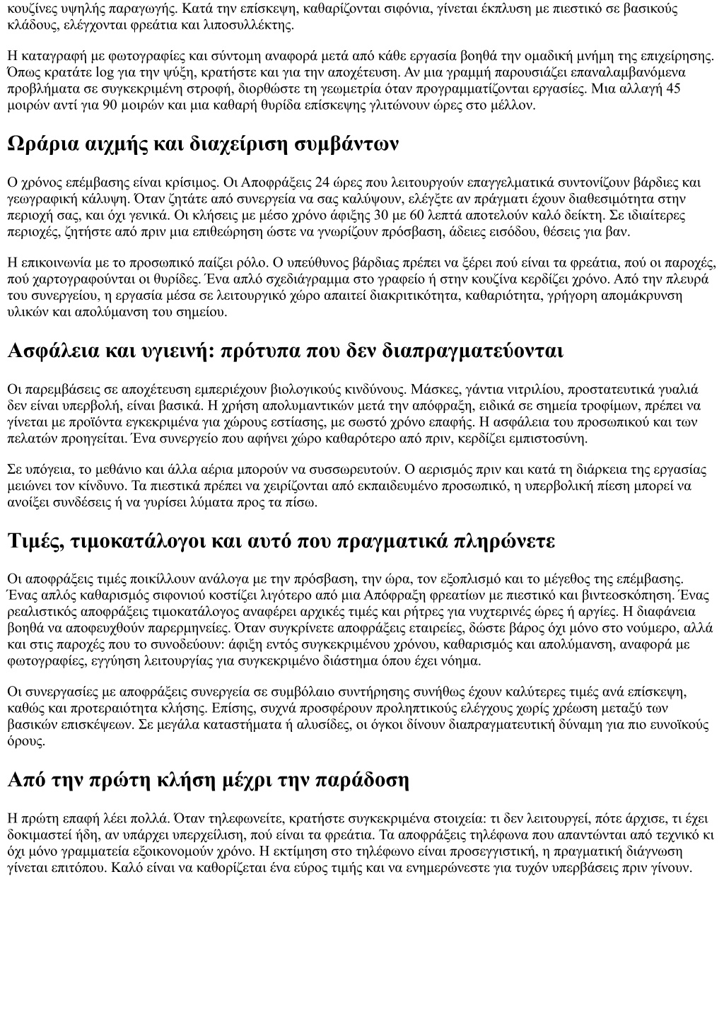 κουζίνες υψηλής παραγωγής. Κατά την επίσκεψη, καθαρίζονται σιφόνια, γίνεται έκπλυση με πιεστικό σε βασικούς κλάδους, ελέγχονται φρεάτια και λιποσυλλέκτης. Η καταγραφή με φωτογραφίες και σύντομη αναφορά μετά από κάθε εργασία βοηθά την ομαδική μνήμη της επιχείρησης. Όπως κρατάτε log για την ψύξη, κρατήστε και για την αποχέτευση. Αν μια γραμμή παρουσιάζει επαναλαμβανόμενα προβλήματα σε συγκεκριμένη στροφή, διορθώστε τη γεωμετρία όταν προγραμματίζονται εργασίες. Μια αλλαγή 45 μοιρών αντί για 90 µοιρών και μια καθαρή θυρίδα επίσκεψης γλιτώνουν ώρες στο μέλλον. Ωράρια αιχμής και διαχείριση συμβάντων Ο χρόνος επέμβασης είναι κρίσιμος. Οι Αποφράξεις 24 ώρες που λειτουργούν επαγγελματικά συντονίζουν βάρδιες και γεωγραφική κάλυψη. Όταν ζητάτε από συνεργεία να σας καλύψουν, ελέγξτε αν πράγματι έχουν διαθεσιμότητα στην περιοχή σας, και όχι γενικά. Οι κλήσεις με μέσο χρόνο άφιξης 30 με 60 λεπτά αποτελούν καλό δείκτη. Σε ιδιαίτερες περιοχές, ζητήστε από πριν μια επιθεώρηση ώστε να γνωρίζουν πρόσβαση, άδειες εισόδου, θέσεις για βαν. Η επικοινωνία με το προσωπικό παίζει ρόλο. Ο υπεύθυνος βάρδιας πρέπει να ξέρει πού είναι τα φρεάτια, πού οι παροχές, πού χαρτογραφούνται οι θυρίδες. Ένα απλό σχεδιάγραμμα στο γραφείο ή στην κουζίνα κερδίζει χρόνο. Από την πλευρά του συνεργείου, η εργασία μέσα σε λειτουργικό χώρο απαιτεί διακριτικότητα, καθαριότητα, γρήγορη απομάκρυνση υλικών και απολύμανση του σημείου. Ασφάλεια και υγιεινή: πρότυπα που δεν διαπραγματεύονται Οι παρεμβάσεις σε αποχέτευση εμπεριέχουν βιολογικούς κινδύνους. Μάσκες, γάντια νιτριλίου, προστατευτικά γυαλιά δεν είναι υπερβολή, είναι βασικά. Η χρήση απολυμαντικών μετά την απόφραξη, ειδικά σε σημεία τροφίμων, πρέπει να γίνεται με προϊόντα εγκεκριμένα για χώρους εστίασης, με σωστό χρόνο επαφής. Η ασφάλεια του προσωπικού και των πελατών προηγείται. Ένα συνεργείο που αφήνει χώρο καθαρότερο από πριν, κερδίζει εμπιστοσύνη. Σε υπόγεια, το μεθάνιο και άλλα αέρια μπορούν να συσσωρευτούν. Ο αερισμός πριν και κατά τη διάρκεια της εργασίας μειώνει τον κίνδυνο. Τα πιεστικά πρέπει να χειρίζονται από εκπαιδευμένο προσωπικό, η υπερβολική πίεση μπορεί να ανοίξει συνδέσεις ή να γυρίσει λύματα προς τα πίσω. Τιμές, τιμοκατάλογοι και αυτό που πραγματικά πληρώνετε Οι αποφράξεις τιμές ποικίλλουν ανάλογα με την πρόσβαση, την ώρα, τον εξοπλισμό και το μέγεθος της επέμβασης. Ένας απλός καθαρισμός σιφονιού κοστίζει λιγότερο από μια Απόφραξη φρεατίων με πιεστικό και βιντεοσκόπηση. Ένας ρεαλιστικός αποφράξεις τιμοκατάλογος αναφέρει αρχικές τιμές και ρήτρες για νυχτερινές ώρες ή αργίες. Η διαφάνεια βοηθά να αποφευχθούν παρερμηνείες. Όταν συγκρίνετε αποφράξεις εταιρείες, δώστε βάρος όχι μόνο στο νούμερο, αλλά και στις παροχές που το συνοδεύουν: άφιξη εντός συγκεκριμένου χρόνου, καθαρισμός και απολύμανση, αναφορά με φωτογραφίες, εγγύηση λειτουργίας για συγκεκριμένο διάστημα όπου έχει νόημα. Οι συνεργασίες με αποφράξεις συνεργεία σε συμβόλαιο συντήρησης συνήθως έχουν καλύτερες τιμές ανά επίσκεψη, καθώς και προτεραιότητα κλήσης. Επίσης, συχνά προσφέρουν προληπτικούς ελέγχους χωρίς χρέωση μεταξύ των βασικών επισκέψεων. Σε μεγάλα καταστήματα ή αλυσίδες, οι όγκοι δίνουν διαπραγματευτική δύναμη για πιο ευνοϊκούς όρους. Από την πρώτη κλήση μέχρι την παράδοση Η πρώτη επαφή λέει πολλά. Όταν τηλεφωνείτε, κρατήστε συγ