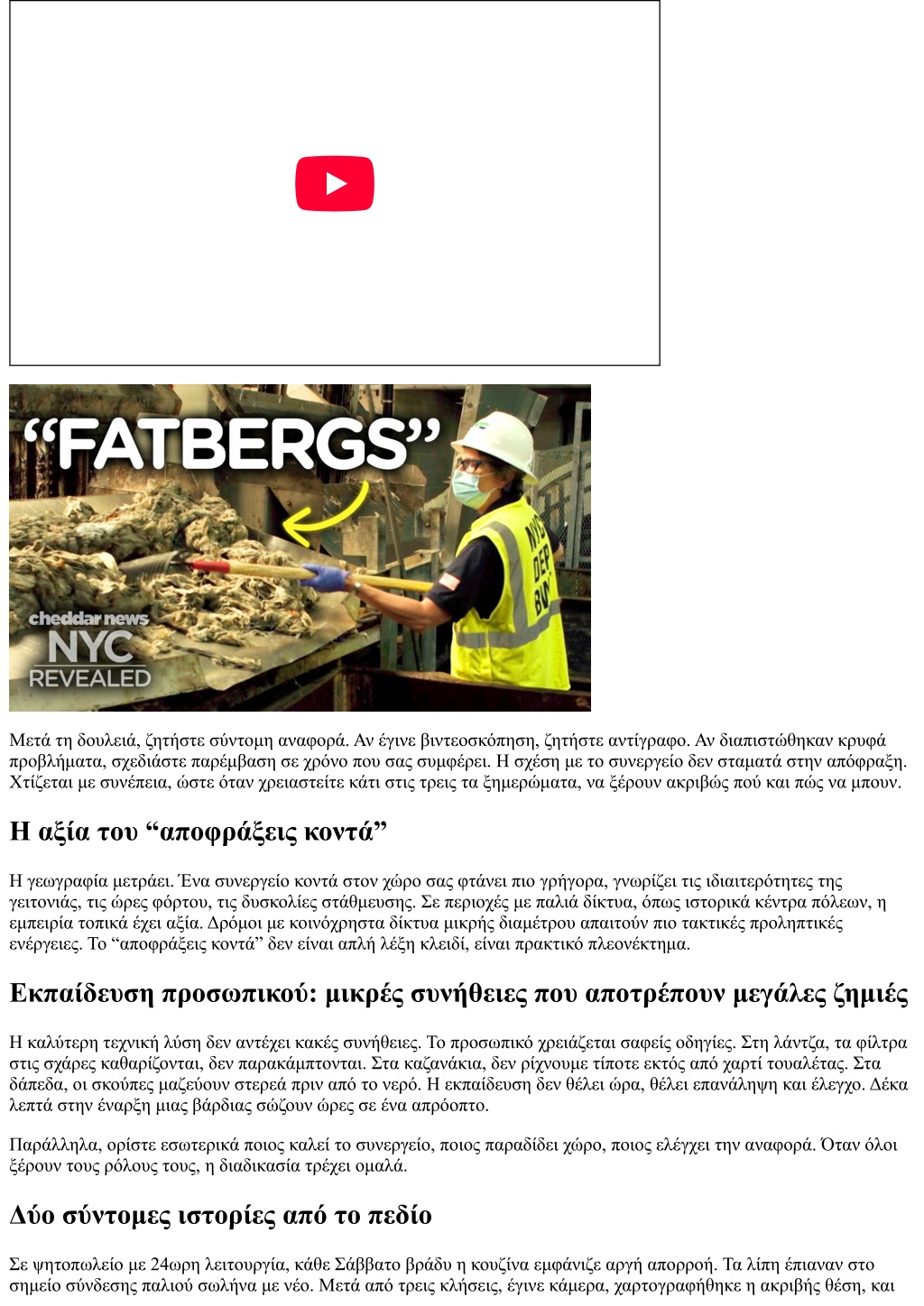 Μετά τη δουλειά, ζητήστε σύντομη αναφορά. Αν έγινε βιντεοσκόπηση, ζητήστε αντίγραφο. Αν διαπιστώθηκαν κρυφά προβλήματα, σχεδιάστε παρέμβαση σε χρόνο που σας συμφέρει. Η σχέση με το συνεργείο δεν σταματά στην απόφραξη. Χτίζεται με συνέπεια, ώστε όταν χρειαστείτε κάτι στις τρεις τα ξημερώματα, να ξέρουν ακριβώς πού και πώς να μπουν. Η αξία του “αποφράξεις κοντά” Η γεωγραφία μετράει. Ένα συνεργείο κοντά στον χώρο σας φτάνει πιο γρήγορα, γνωρίζει τις ιδιαιτερότητες της γειτονιάς, τις ώρες φόρτου, τις δυσκολίες στάθμευσης. Σε περιοχές με παλιά δίκτυα, όπως ιστορικά κέντρα πόλεων, η εμπειρία τοπικά έχει αξία. Δρόμοι με κοινόχρηστα δίκτυα μικρής διαμέτρου απαιτούν πιο τακτικές προληπτικές ενέργειες. Το “αποφράξεις κοντά” δεν είναι απλή λέξη κλειδί, είναι πρακτικό πλεονέκτημα. Εκπαίδευση προσωπικού: μικρές συνήθειες που αποτρέπουν μεγάλες ζημιές Η καλύτερη τεχνική λύση δεν αντέχει κακές συνήθειες. Το προσωπικό χρειάζεται σαφείς οδηγίες. Στη λάντζα, τα φίλτρα στις σχάρες καθαρίζονται, δεν παρακάμπτονται. Στα καζανάκια, δεν ρίχνουμε τίποτε εκτός από χαρτί τουαλέτας. Στα δάπεδα, οι σκούπες μαζεύουν στερεά πριν από το νερό. Η εκπαίδευση δεν θέλει ώρα, θέλει επανάληψη και έλεγχο. Δέκα λεπτά στην έναρξη μιας βάρδιας σώζουν ώρες σε ένα απρόοπτο. Παράλληλα, ορίστε εσωτερικά ποιος καλεί το συνεργείο, ποιος παραδίδει χώρο, ποιος ελέγχει την αναφορά. Όταν όλοι ξέρουν τους ρόλους τους, η διαδικασία τρέχει ομαλά. Δύο σύντομες ιστορίες από το πεδίο Σε ψητοπωλείο με 24ωρη λειτουργία, κάθε Σάββατο βράδυ η κουζίνα εμφάνιζε αργή απορροή. Τα λίπη έπιαναν στο σημείο σύνδεσης παλιού σωλήνα με νέο. Μετά από τρεις κλήσεις, έγινε κάμερα, χαρτογραφήθηκε η ακριβής θέση, και