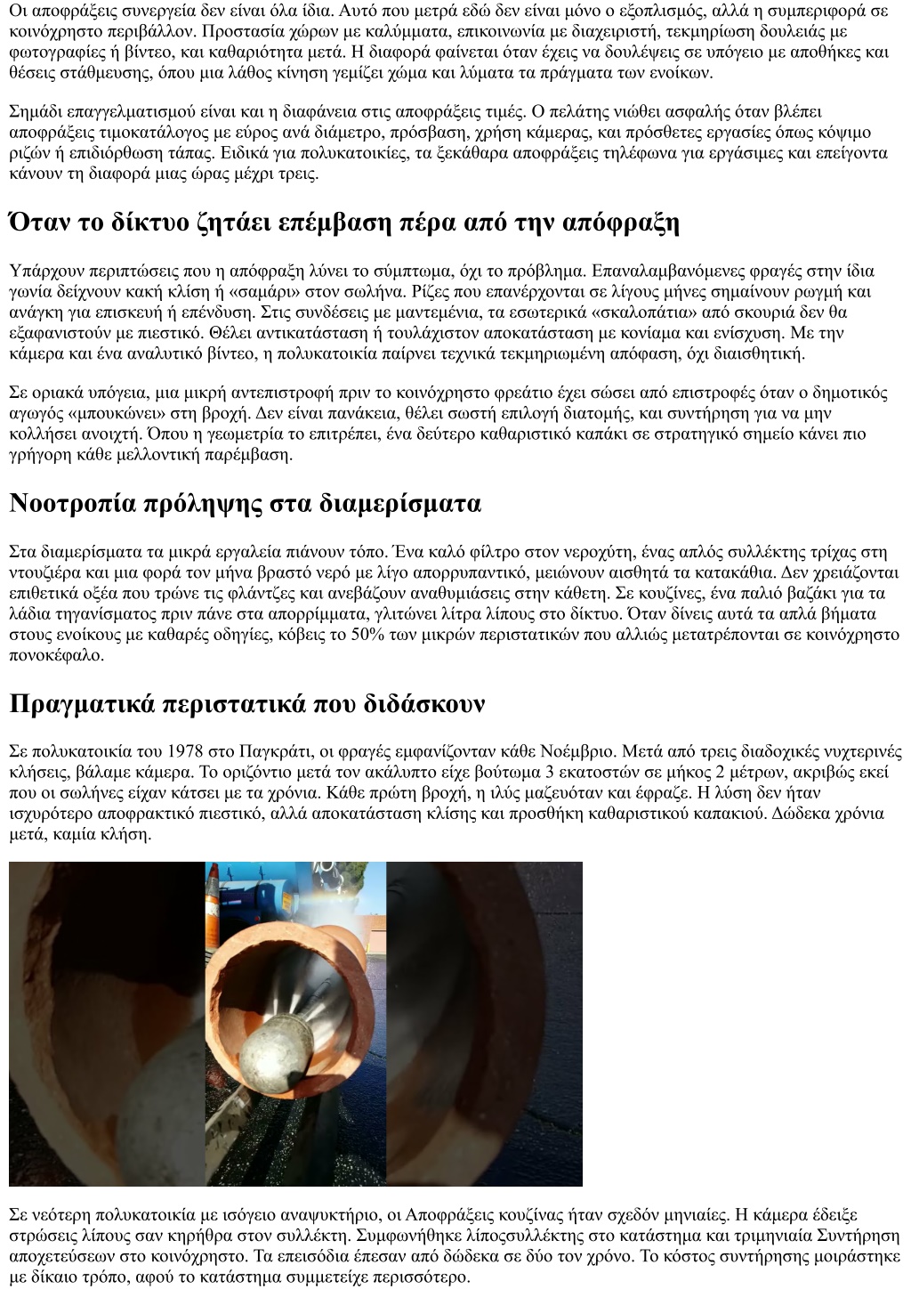 Σε υπόγειο στη Νίκαια, πλημμύρα ξανά και ξανά κάθε μεγάλη μπόρα. Η δημοτική γραμμή δεν άντεχε ταυτόχρονες παροχές. Η λύση ήρθε με αντεπιστροφή στην έξοδο και εφεδρική αντλία με φλοτέρ για έκτακτη αποσυμφόρηση. Οι antliseis έγιναν παρελθόν και οι ένοικοι κοιμούνται ήσυχοι με βροχή. Επιλογή υπηρεσιών και διαχείριση κόστους Η αγορά έχει εύρος. Από μικρά συνεργεία με ένα βαν, μέχρι οργανωμένες Αποφρακτική εταιρείες με στόλο και 24ωρη κάλυψη. Δεν χρειάζεται πάντα ο βαρύς εξοπλισμός, αλλά για πολυκατοικίες είναι χρήσιμο να έχεις συνεργάτη που διαθέτει αποφράξεις πιεστικο, κάμερα και δυνατότητα για άμεσες antliseis. Στα αποφράξεις τιμές, προσοχή στα «από» που κρύβουν εκπλήξεις. Η καλή πρακτική είναι γραπτή προσφορά με σενάρια: απλό άνοιγμα, χρήση κάμερας, καθαρισμός οριζόντιων, κοπή ριζών, και πιεστικό με ζεστό νερό. Έτσι η συνέλευση αποφασίζει με πλήρη εικόνα. Αν μιλάμε για αποφράξεις κοντά σε πυκνές περιοχές, ο χρόνος ανταπόκρισης είναι κριτήριο. Ένα συνεργείο που φτάνει σε 45 λεπτά αντί για δύο ώρες, σώζει ζημιές στα ισόγεια. Οι διαχειριστές καλά κάνουν να κρατούν δύο αποφράξεις τηλέφωνα αξιόπιστων προμηθευτών. Επίσης, να ζητούν φωτογραφική τεκμηρίωση μετά από δύσκολες επεμβάσεις. Το αρχείο αυτό δικαιολογεί δαπάνες και χτίζει ιστορικό. Νομική και ασφαλιστική διάσταση Στα κοινόχρηστα, οι ζημιές μοιράζονται. Όταν μια φραγή λουτρού στον τρίτο προκαλεί ζημιά στο δεύτερο, η ευθύνη δεν είναι πάντα αυτονόητη. Η κάμερα και το πρωτόκολλο της επέμβασης βοηθούν να αποδειχθεί αν το πρόβλημα ήταν στο κοινόχρηστο ή στο ιδιόκτητο. Οι ασφαλιστικές καλύπτουν συχνά ζημιές από διαρροές, όχι όμως την αποκατάσταση της φραγής. Καλό είναι ο διαχειριστής να γνωρίζει τους όρους, να κρατά αποδείξεις και να ενημερώνει τους ενοίκους για τις καλύψεις. Σε κτίρια με ιστορικό επεισοδίων, μια μικρή πρόσθετη κάλυψη για αποχετευτικά συμβάντα κοστίζει λιγότερο από μια μέση νυχτερινή κλήση. Επικοινωνία στην κρίση Όταν τα νερά ανεβαίνουν στο υπόγειο, οι τόνοι ανεβαίνουν κι αυτοί. Η εμπειρία λέει ότι τα τρία πρώτα τηλεφωνήματα είναι κρίσιμα: συνεργείο, υδραυλικός/ηλεκτρολόγος αν χρειαστεί διακοπή ισχύος σε υπόγεια, και διαχειριστής για ενημέρωση. Μετά, σύντομη ανακοίνωση στους ενοίκους για αποφυγή χρήσης νερού έως ότου αποκατασταθεί η ροή. Καλό είναι να υπάρχει έτοιμο σενάριο μηνυμάτων, ώστε να μη χαθεί χρόνος στη σύνταξη. Η διαφορά μεταξύ άναρχης και οργανωμένης αντίδρασης φαίνεται στις ζημιές που τελικά καταγράφονται. Όταν βγάζει νόημα μια κάμερα πριν γίνει το πρόβλημα Δεν χρειάζεται κάμερα σε κάθε συντήρηση. Χρειάζεται όμως σε κτίρια με παλιές σωληνώσεις, με πρόσφατες ανακαινίσεις που ίσως άφησαν μπάζα σε σωλήνες, με έντονη ριζοβλάστηση στον ακάλυπτο, ή με επαναλαμβανόμενα περιστατικά σε έναν όροφο. Η προληπτική κάμερα βρίσκει αντικείμενα που δεν φαντάζεσαι, από σφουγγαράκια μέχρι πλαστικά καπάκια. Μια αξιοπιστία στις αποφράξεις φορά σε κτίριο του Ζωγράφου εντοπίσαμε μπετονάκι με τσιμέντο που είχε πέσει σε ανακαίνιση και είχε «κάτσει» στο ταφ. Αν δεν το βλέπαμε, θα ξαναγυρίζαμε κάθε δύο μήνες. Ποιότητα νερού και οσμές Οι οσμές ανεβαίνουν από σιφόνια που έχουν στεγνώσει, από ανήσυχες τάπες ή από υποπίεση όταν πέφτουν μεγάλες παροχές. Στις πολυκατοικίες οι οσμές δεν είναι μόνο ενόχληση, είναι ένδειξη. Αν έρχεται μυρωδιά λυμάτων στον τέταρτο όταν αδειάζει η μπανιέρα του