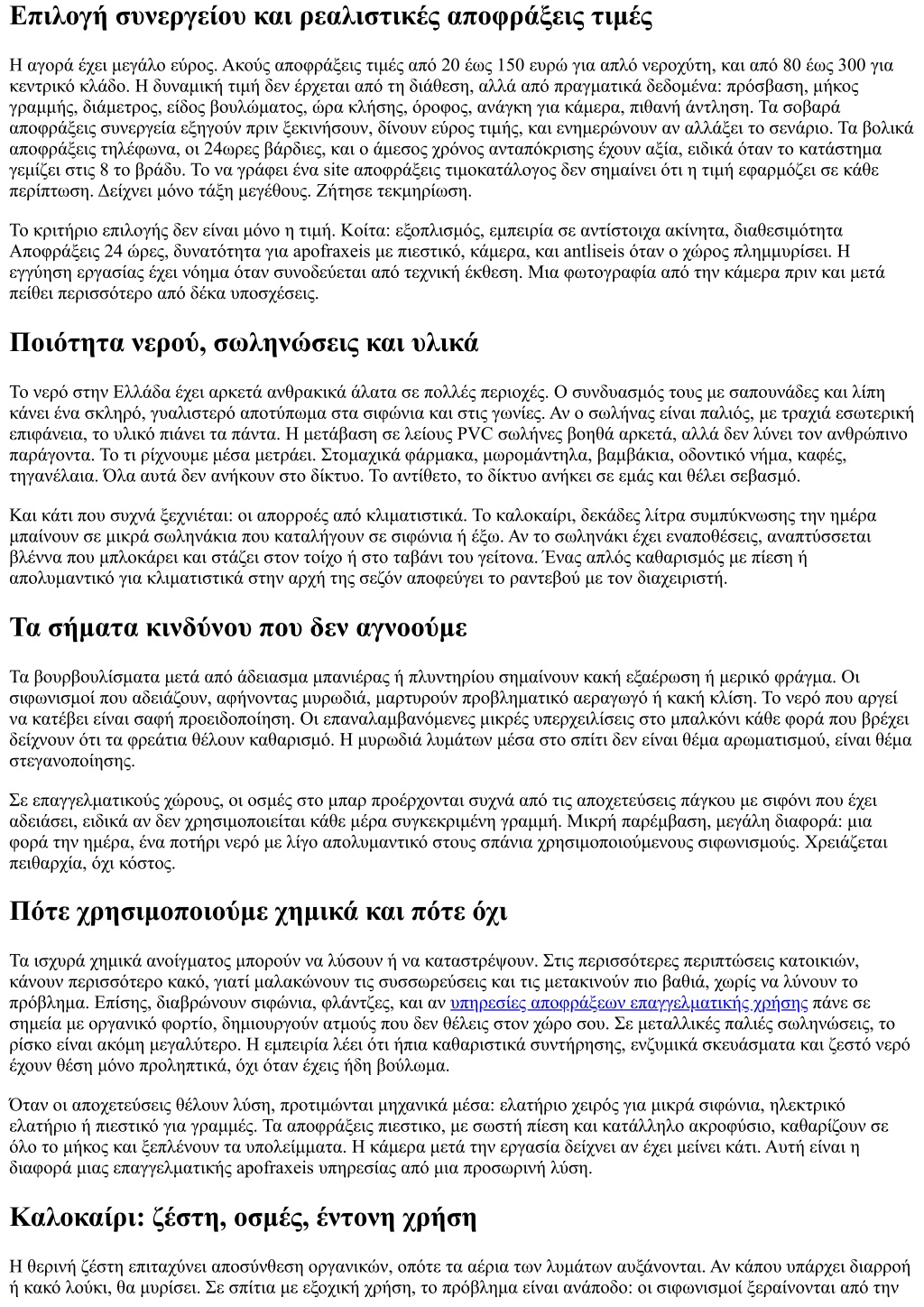 Επιλογή συνεργείου και ρεαλιστικές αποφράξεις τιμές Η αγορά έχει μεγάλο εύρος. Ακούς αποφράξεις τιμές από 20 έως 150 ευρώ για απλό νεροχύτη, και από 80 έως 300 για κεντρικό κλάδο. Η δυναμική τιμή δεν έρχεται από τη διάθεση, αλλά από πραγματικά δεδομένα: πρόσβαση, μήκος γραμμής, διάμετρος, είδος βουλώματος, ώρα κλήσης, όροφος, ανάγκη για κάμερα, πιθανή άντληση. Τα σοβαρά αποφράξεις συνεργεία εξηγούν πριν ξεκινήσουν, δίνουν εύρος τιμής, και ενημερώνουν αν αλλάξει το σενάριο. Τα βολικά αποφράξεις τηλέφωνα, οι 24ωρες βάρδιες, και ο άμεσος χρόνος ανταπόκρισης έχουν αξία, ειδικά όταν το κατάστημα γεμίζει στις 8 το βράδυ. Το να γράφει ένα site αποφράξεις τιμοκατάλογος δεν σημαίνει ότι η τιμή εφαρμόζει σε κάθε περίπτωση. Δείχνει μόνο τάξη μεγέθους. Ζήτησε τεκμηρίωση. Το κριτήριο επιλογής δεν είναι μόνο η τιμή. Κοίτα: εξοπλισμός, εμπειρία σε αντίστοιχα ακίνητα, διαθεσιμότητα Αποφράξεις 24 ώρες, δυνατότητα για apofraxeis με πιεστικό, κάμερα, και antliseis όταν ο χώρος πλημμυρίσει. Η εγγύηση εργασίας έχει νόημα όταν συνοδεύεται από τεχνική έκθεση. Μια φωτογραφία από την κάμερα πριν και μετά πείθει περισσότερο από δέκα υποσχέσεις. Ποιότητα νερού, σωληνώσεις και υλικά Το νερό στην Ελλάδα έχει αρκετά ανθρακικά άλατα σε πολλές περιοχές. Ο συνδυασμός τους με σαπουνάδες και λίπη κάνει ένα σκληρό, γυαλιστερό αποτύπωμα στα σιφώνια και στις γωνίες. Αν ο σωλήνας είναι παλιός, με τραχιά εσωτερική επιφάνεια, το υλικό πιάνει τα πάντα. Η μετάβαση σε λείους PVC σωλήνες βοηθά αρκετά, αλλά δεν λύνει τον ανθρώπινο παράγοντα. Το τι ρίχνουμε μέσα μετράει. Στομαχικά φάρμακα, μωρομάντηλα, βαμβάκια, οδοντικό νήμα, καφές, τηγανέλαια. Όλα αυτά δεν ανήκουν στο δίκτυο. Το αντίθετο, το δίκτυο ανήκει σε εμάς και θέλει σεβασμό. Και κάτι που συχνά ξεχνιέται: οι απορροές από κλιματιστικά. Το καλοκαίρι, δεκάδες λίτρα συμπύκνωσης την ημέρα μπαίνουν σε μικρά σωληνάκια που καταλήγουν σε σιφώνια ή έξω. Αν το σωληνάκι έχει εναποθέσεις, αναπτύσσεται βλέννα που μπλοκάρει και στάζει στον τοίχο ή στο ταβάνι του γείτονα. Ένας απλός καθαρισμός με πίεση ή απολυμαντικό για κλιματιστικά στην αρχή της σεζόν αποφεύγει το ραντεβού με τον διαχειριστή. Τα σήματα κινδύνου που δεν αγνοούμε Τα βουρβουλίσματα μετά από άδειασμα μπανιέρας ή πλυντηρίου σημαίνουν κακή εξαέρωση ή μερικό φράγμα. Οι σιφωνισμοί που αδειάζουν, αφήνοντας μυρωδιά, μαρτυρούν προβληματικό αεραγωγό ή κακή κλίση. Το νερό που αργεί να κατέβει είναι σαφή προειδοποίηση. Οι επαναλαμβανόμενες μικρές υπερχειλίσεις στο μπαλκόνι κάθε φορά που βρέχει δείχνουν ότι τα φρεάτια θέλουν καθαρισμό. Η μυρωδιά λυμάτων μέσα στο σπίτι δεν είναι θέμα αρωματισμού, είναι θέμα στεγανοποίησης. Σε επαγγελματικούς χώρους, οι οσμές στο μπαρ προέρχονται συχνά από τις αποχετεύσεις πάγκου με σιφόνι που έχει αδειάσει, ειδικά αν δεν χρησιμοποιείται κάθε μέρα συγκεκριμένη γραμμή. Μικρή παρέμβαση, μεγάλη διαφορά: μια φορά την ημέρα, ένα ποτήρι νερό με λίγο απολυμαντικό στους σπάνια χρησιμοποιούμενους σιφωνισμούς. Χρειάζεται πειθαρχία, όχι κόστος. Πότε χρησιμοποιούμε χημικά και πότε όχι Τα ισχυρά χημικά ανοίγματος μπορούν να λύσουν ή να καταστρέψουν. Στις περισσότερες περιπτώσεις κατοικιών, κάνουν περισσότερο κακό, γιατί μαλακώνουν τις συσσωρεύσεις και τις μετακινούν πιο βαθιά, χωρίς να λύνουν το πρόβλημα. Επίσης, διαβρώνουν σιφώνια, φλάντζες, και αν υπηρεσίες αποφράξεων επαγγε