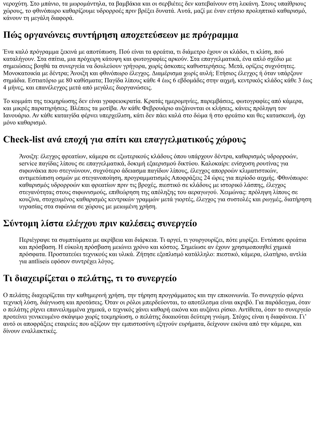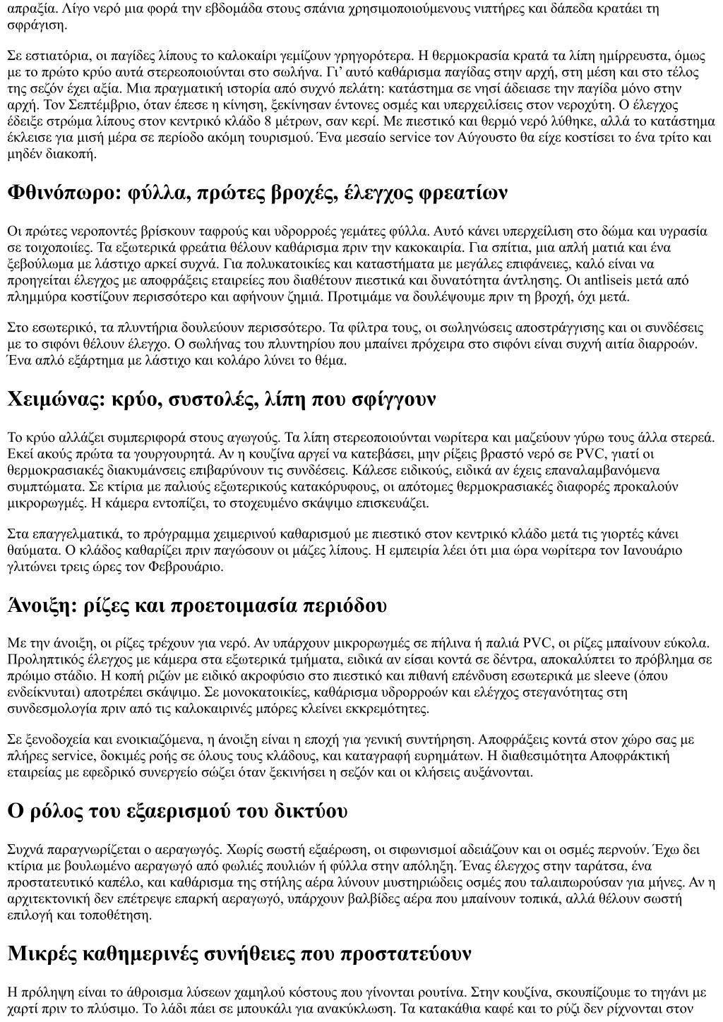νεροχύτη. Στο μπάνιο, τα μωρομάντηλα, τα βαμβάκια και οι σερβιέτες δεν κατεβαίνουν στη λεκάνη. Στους υπαίθριους χώρους, το φθινόπωρο καθαρίζουμε υδρορροές πριν βρέξει δυνατά. Αυτά, μαζί με έναν ετήσιο προληπτικό καθαρισμό, κάνουν τη μεγάλη διαφορά. Πώς οργανώνεις συντήρηση αποχετεύσεων με πρόγραμμα Ένα καλό πρόγραμμα ξεκινά με αποτύπωση. Πού είναι τα φρεάτια, τι διάμετρο έχουν οι κλάδοι, τι κλίση, πού καταλήγουν. Στα σπίτια, μια πρόχειρη κάτοψη και φωτογραφίες αρκούν. Στα επαγγελματικά, ένα απλό σχέδιο με σημειώσεις βοηθά τα συνεργεία να δουλεύουν γρήγορα, χωρίς άσκοπες καθυστερήσεις. Μετά, ορίζεις συχνότητες. Μονοκατοικία με δέντρα; Άνοιξη και φθινόπωρο έλεγχος. Διαμέρισμα χωρίς αυλή; Ετήσιος έλεγχος ή όταν υπάρξουν σημάδια. Εστιατόριο με 80 καθίσματα; Παγίδα λίπους κάθε 4 έως 6 εβδομάδες στην αιχμή, κεντρικός κλάδος κάθε 3 έως 4 μήνες, και επανέλεγχος μετά από μεγάλες διοργανώσεις. Το κομμάτι της τεκμηρίωσης δεν είναι γραφειοκρατία. Κρατάς ημερομηνίες, παρεμβάσεις, φωτογραφίες από κάμερα, και μικρές παρατηρήσεις. Βλέπεις τα μοτίβα. Αν κάθε Φεβρουάριο αυξάνονται οι κλήσεις, κάνεις πρόληψη τον Ιανουάριο. Αν κάθε καταιγίδα φέρνει υπερχείλιση, κάτι δεν πάει καλά στο δώμα ή στο φρεάτιο και θες κατασκευή, όχι μόνο καθαρισμό. Check-list ανά εποχή για σπίτι και επαγγελματικούς χώρους Άνοιξη: έλεγχος φρεατίων, κάμερα σε εξωτερικούς κλάδους όπου υπάρχουν δέντρα, καθαρισμός υδρορροών, service παγίδας λίπους σε επαγγελματικά, δοκιμή εξαερισμού δικτύου. Καλοκαίρι: ενίσχυση ρουτίνας για σιφωνάκια που στεγνώνουν, συχνότερο άδειασμα παγίδων λίπους, έλεγχος απορροών κλιματιστικών, αντιμετώπιση οσμών με στεγανοποίηση, προγραμματισμός Αποφράξεις 24 ώρες για περίοδο αιχμής. Φθινόπωρο: καθαρισμός υδρορροών και φρεατίων πριν τις βροχές, πιεστικό σε κλάδους με ιστορικό λάσπης, έλεγχος στεγανότητας στους σιφωνισμούς, επιθεώρηση της απόληξης του αεραγωγού. Χειμώνας: πρόληψη λίπους σε κουζίνα, στοχευμένος καθαρισμός κεντρικών γραμμών μετά γιορτές, έλεγχος για συστολές και ρωγμές, διατήρηση υγρασίας στα σιφώνια σε χώρους με μειωμένη χρήση. Σύντομη λίστα ελέγχου πριν καλέσεις συνεργείο Περιέγραψε τα συμπτώματα με ακρίβεια και διάρκεια. Τι αργεί, τι γουργουρίζει, πότε μυρίζει. Εντόπισε φρεάτια και πρόσβαση. Η εύκολη πρόσβαση μειώνει χρόνο και κόστος. Σημείωσε αν έχουν χρησιμοποιηθεί χημικά πρόσφατα. Προστατεύει τεχνικούς και υλικά. Ζήτησε εξοπλισμό κατάλληλο: πιεστικό, κάμερα, ελατήριο, αντλία για antliseis εφόσον συντρέχει λόγος. Τι διαχειρίζεται ο πελάτης, τι το συνεργείο Ο πελάτης διαχειρίζεται την καθημερινή χρήση, την τήρηση προγράμματος και την επικοινωνία. Το συνεργείο φέρνει τεχνική λύση, διάγνωση και προτάσεις. Όταν οι ρόλοι μπερδεύονται, το αποτέλεσμα είναι ακριβό. Για παράδειγμα, όταν ο πελάτης ρίχνει επανειλημμένα χημικά, ο τεχνικός χάνει καθαρή εικόνα και αυξάνει ρίσκο. Αντίθετα, όταν το συνεργείο προτείνει γενικευμένο σκάψιμο χωρίς τεκμηρίωση, ο πελάτης δικαιούται δεύτερη γνώμη. Στόχος είναι η διαφάνεια. Γι’ αυτό οι αποφράξεις εταιρείες που αξίζουν την εμπιστοσύνη εξηγούν ευρήματα, δείχνουν εικόνα από την κάμερα, και δίνουν εναλλακτικές.