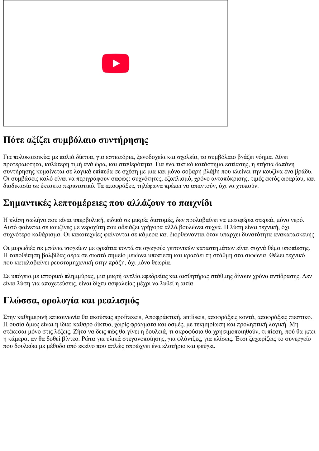 Πότε αξίζει συμβόλαιο συντήρησης Για πολυκατοικίες με παλιά δίκτυα, για εστιατόρια, ξενοδοχεία και σχολεία, το συμβόλαιο βγάζει νόημα. Δίνει προτεραιότητα, καλύτερη τιμή ανά ώρα, και σταθερότητα. Για ένα τυπικό κατάστημα εστίασης, η ετήσια δαπάνη συντήρησης κυμαίνεται σε λογικά επίπεδα σε σχέση με μια και μόνο σοβαρή βλάβη που κλείνει την κουζίνα ένα βράδυ. Οι συμβάσεις καλό είναι να περιγράφουν σαφώς: συχνότητες, εξοπλισμό, χρόνο ανταπόκρισης, τιμές εκτός ωραρίου, και διαδικασία σε έκτακτο περιστατικό. Τα αποφράξεις τηλέφωνα πρέπει να απαντούν, όχι να χτυπούν. Σημαντικές λεπτομέρειες που αλλάζουν το παιχνίδι Η κλίση σωλήνα που είναι υπερβολική, ειδικά σε μικρές διατομές, δεν προλαβαίνει να μεταφέρει στερεά, μόνο νερό. Αυτό φαίνεται σε κουζίνες με νεροχύτη που αδειάζει γρήγορα αλλά βουλώνει συχνά. Η λύση είναι τεχνική, όχι συχνότερο καθάρισμα. Οι κακοτεχνίες φαίνονται σε κάμερα και διορθώνονται όταν υπάρχει δυνατότητα ανακατασκευής. Οι μυρωδιές σε μπάνια ισογείων με φρεάτια κοντά σε αγωγούς γειτονικών καταστημάτων είναι συχνά θέμα υποπίεσης. Η τοποθέτηση βαλβίδας αέρα σε σωστό σημείο μειώνει υποπίεση και κρατάει τη στάθμη στα σιφώνια. Θέλει τεχνικό που καταλαβαίνει ρευστομηχανική στην πράξη, όχι μόνο θεωρία. Σε υπόγεια με ιστορικό πλημμύρας, μια μικρή αντλία εφεδρείας και αισθητήρας στάθμης δίνουν χρόνο αντίδρασης. Δεν είναι λύση για αποχετεύσεις, είναι δίχτυ ασφαλείας μέχρι να λυθεί η αιτία. Γλώσσα, ορολογία και ρεαλισμός Στην καθημερινή επικοινωνία θα ακούσεις apofraxeis, Αποφράκτική, antliseis, αποφράξεις κοντά, αποφράξεις πιεστικο. Η ουσία όμως είναι η ίδια: καθαρό δίκτυο, χωρίς φράγματα και οσμές, με τεκμηρίωση και προληπτική λογική. Μη στέκεσαι μόνο στις λέξεις. Ζήτα να δεις πώς θα γίνει η δουλειά, τι ακροφύσια θα χρησιμοποιηθούν, τι πίεση, πού θα μπει η κάμερα, αν θα δοθεί βίντεο. Ρώτα για υλικά στεγανοποίησης, για φλάντζες, για κλίσεις. Έτσι ξεχωρίζεις το συνεργείο που δουλεύει με μέθοδο από εκείνο που απλώς σπρώχνει ένα ελατήριο και φεύγει.