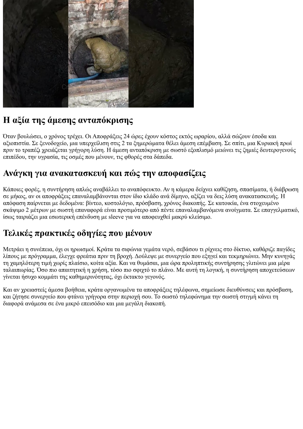 Η αξία της άμεσης ανταπόκρισης Όταν βουλώσει, ο χρόνος τρέχει. Οι Αποφράξεις 24 ώρες έχουν κόστος εκτός ωραρίου, αλλά σώζουν έσοδα και αξιοπιστία. Σε ξενοδοχείο, μια υπερχείλιση στις 2 τα ξημερώματα θέλει άμεση επέμβαση. Σε σπίτι, μια Κυριακή πρωί πριν το τραπέζι χρειάζεται γρήγορη λύση. Η άμεση ανταπόκριση με σωστό εξοπλισμό μειώνει τις ζημιές δευτερογενούς επιπέδου, την υγρασία, τις οσμές που μένουν, τις φθορές στα δάπεδα. Ανάγκη για ανακατασκευή και πώς την αποφασίζεις Κάποιες φορές, η συντήρηση απλώς αναβάλλει το αναπόφευκτο. Αν η κάμερα δείχνει καθίζηση, σπασίματα, ή διάβρωση σε μήκος, αν οι αποφράξεις επαναλαμβάνονται στον ίδιο κλάδο ανά δίμηνο, αξίζει να δεις λύση ανακατασκευής. Η απόφαση παίρνεται με δεδομένα: βίντεο, κοστολόγιο, πρόσβαση, χρόνος διακοπής. Σε κατοικία, ένα στοχευμένο σκάψιμο 2 μέτρων με σωστή επαναφορά είναι προτιμότερο από πέντε επαναλαμβανόμενα ανοίγματα. Σε επαγγελματικό, ίσως ταιριάζει μια εσωτερική επένδυση με sleeve για να αποφευχθεί μακρύ κλείσιμο. Τελικές πρακτικές οδηγίες που μένουν Μετράει η συνέπεια, όχι οι ηρωισμοί. Κράτα τα σιφώνια γεμάτα νερό, σεβάσου τι ρίχνεις στο δίκτυο, καθάριζε παγίδες λίπους με πρόγραμμα, έλεγχε φρεάτια πριν τη βροχή. Δούλεψε με συνεργείο που εξηγεί και τεκμηριώνει. Μην κυνηγάς τη χαμηλότερη τιμή χωρίς πλαίσιο, κοίτα αξία. Και να θυμάσαι, μια ώρα προληπτικής συντήρησης γλιτώνει μια μέρα ταλαιπωρίας. Όσο πιο απαιτητική η χρήση, τόσο πιο σφιχτό το πλάνο. Με αυτή τη λογική, η συντήρηση αποχετεύσεων γίνεται ήσυχο κομμάτι της καθημερινότητας, όχι έκτακτο γεγονός. Και αν χρειαστείς άμεσα βοήθεια, κράτα οργανωμένα τα αποφράξεις τηλέφωνα, σημείωσε διευθύνσεις και πρόσβαση, και ζήτησε συνεργείο που φτάνει γρήγορα στην περιοχή σου. Το σωστό τηλεφώνημα την σωστή στιγμή κάνει τη διαφορά ανάμεσα σε ένα μικρό επεισόδιο και μια μεγάλη διακοπή.