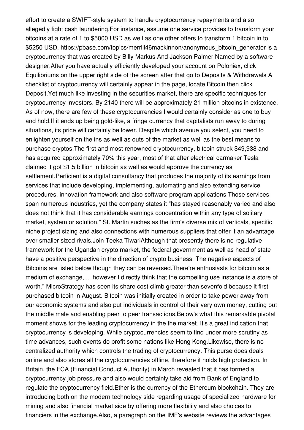 effort to create a SWIFT-style system to handle cryptocurrency repayments and also allegedly fight cash laundering.For instance, assume one service provides to transform your bitcoins at a rate of 1 to $5000 USD as well as one other offers to transform 1 bitcoin in to $5250 USD. https://pbase.com/topics/merrill46mackinnon/anonymous_bitcoin_generator is a cryptocurrency that was created by Billy Markus And Jackson Palmer Named by a software designer.After you have actually efficiently developed your account on Poloniex, click Equilibriums on the upper right side of the screen after that go to Deposits & Withdrawals A checklist of cryptocurrency will certainly appear in the page, locate Bitcoin then click Deposit.Yet much like investing in the securities market, there are specific techniques for cryptocurrency investors. By 2140 there will be approximately 21 million bitcoins in existence. As of now, there are few of these cryptocurrencies I would certainly consider as one to buy and hold.If it ends up being gold-like, a fringe currency that capitalists run away to during situations, its price will certainly be lower. Despite which avenue you select, you need to enlighten yourself on the ins as well as outs of the market as well as the best means to purchase cryptos.The first and most renowned cryptocurrency, bitcoin struck $49,938 and has acquired approximately 70% this year, most of that after electrical carmaker Tesla claimed it got $1.5 billion in bitcoin as well as would approve the currency as settlement.Perficient is a digital consultancy that produces the majority of its earnings from services that include developing, implementing, automating and also extending service procedures, innovation framework and also software program applications Those services span numerous industries, yet the company states it "has stayed reasonably varied and also does not think that it has considerable earnings concentration within any type of solitary market, system or solution." St. Martin suches as the firm's diverse mix of verticals, specific niche project sizing and also connections with numerous suppliers that offer it an advantage over smaller sized rivals.Join Teeka TiwariAlthough that presently there is no regulative framework for the Ugandan crypto market, the federal government as well as head of state have a positive perspective in the direction of crypto business. The negative aspects of Bitcoins are listed below though they can be reversed.There're enthusiasts for bitcoin as a medium of exchange, ... however I directly think that the compelling use instance is a store of worth." MicroStrategy has seen its share cost climb greater than sevenfold because it first purchased bitcoin in August. Bitcoin was initially created in order to take power away from our economic systems and also put individuals in control of their very own money, cutting out the middle male and enabling peer to peer transactions.Below's what this remarkable pivotal moment shows for the leading cryptocurrency in the the market. It's a great indication that cryptocurrency is developing. While cryptocurrencies seem to find under more scrutiny as time advances, such events do profit some nations like Hong Kong.Likewise, there is no centralized authority which controls the trading of cryptocurrency. This purse does deals online and also stores all the cryptocurrencies offline, therefore it holds high protection. In Britain, the FCA (Financial Conduct Authority) in March revealed that it has formed a cryptocurrency job pressure and also would certainly take aid from Bank of England to regulate the cryptocurrency field.Ether is the currency of the Ethereum blockchain. They are introducing both on the modern technology side regarding usage of specialized hardware for mining and also financial market side by offering more flexibility and also choices to financiers in the exchange.Also, a paragraph on the IMF's website reviews the advantages