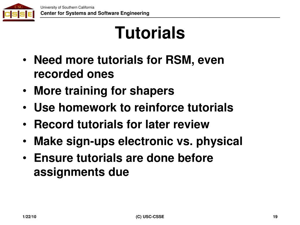 Tutorials • Need more tutorials for RSM, even recorded ones • More training for shapers • Use homework to reinforce tutorials • Record tutorials for later review • Make sign-ups electronic vs. physical • Ensure tutorials are done before assignments due (C) USC-CSSE
