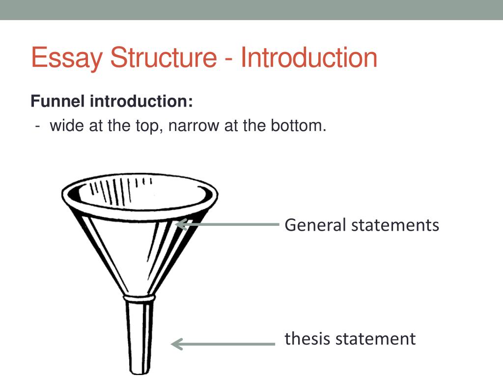 Essay Structure - Introduction Funnel introduction: - wide at the top, narrow at the bottom. General statements thesis statement