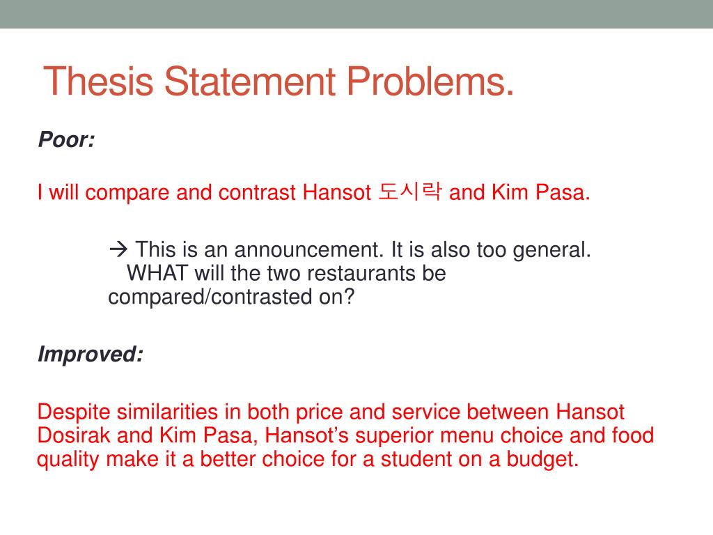Thesis Statement Problems. Poor: I will compare and contrast Hansot도시락 and Kim Pasa. This is an announcement. It is also too general. WHAT will the two restaurants be compared/contrasted on? Improved: Despite similarities in both price and service between HansotDosirak and Kim Pasa, Hansot’s superior menu choice and food quality make it a better choice for a student on a budget.