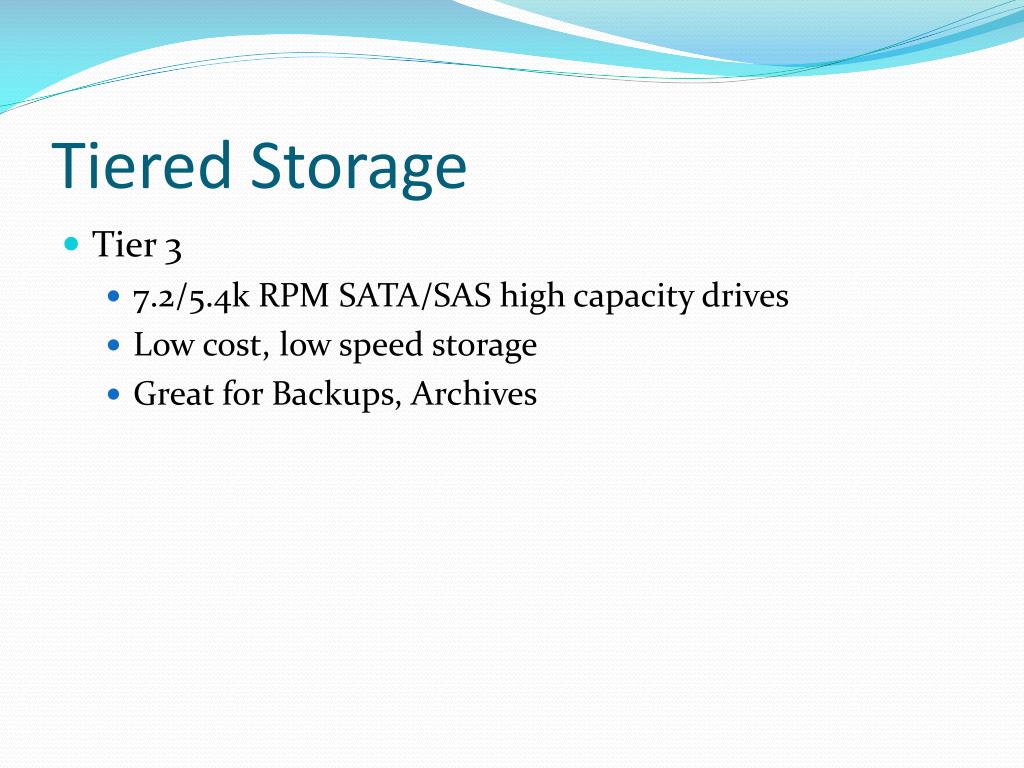 Tiered Storage • Tier 3 • 7.2/5.4k RPM SATA/SAS high capacity drives • Low cost, low speed storage • Great for Backups, Archives