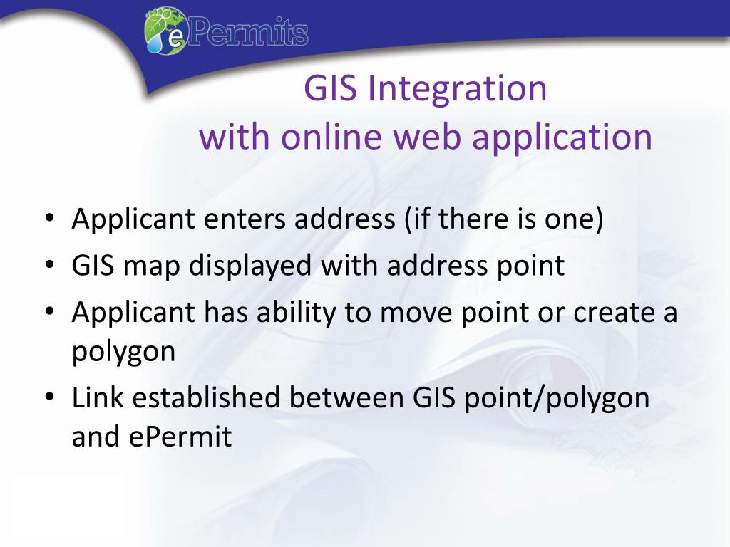 GIS Integrationwith online web application • Applicant enters address (if there is one) • GIS map displayed with address point • Applicant has ability to move point or create a polygon • Link established between GIS point/polygon and ePermit