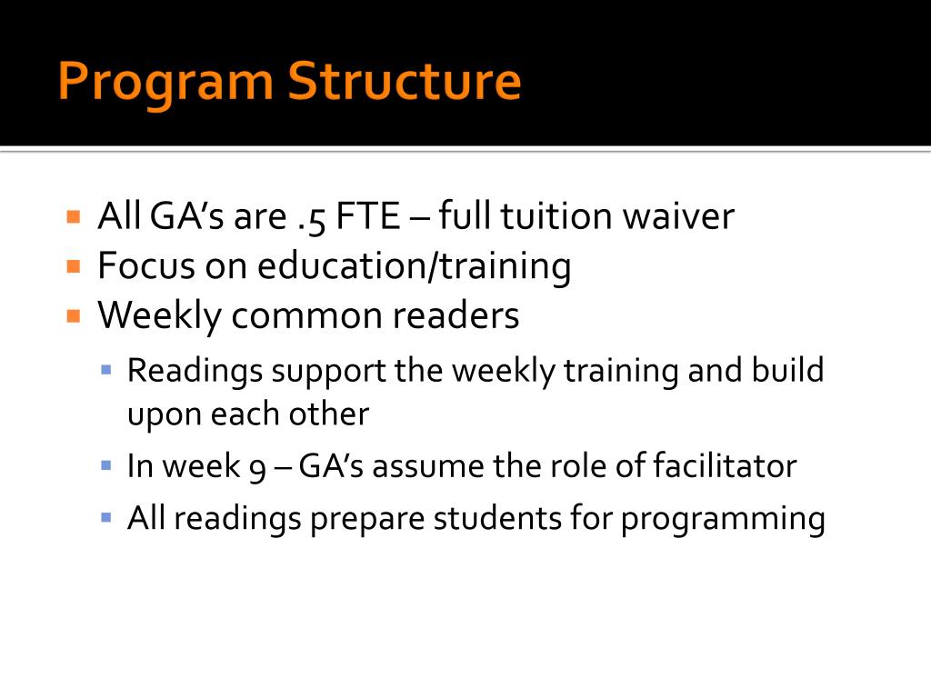 Program Structure • All GA’s are .5 FTE – full tuition waiver • Focus on education/training • Weekly common readers • Readings support the weekly training and build upon each other • In week 9 – GA’s assume the role of facilitator • All readings prepare students for programming