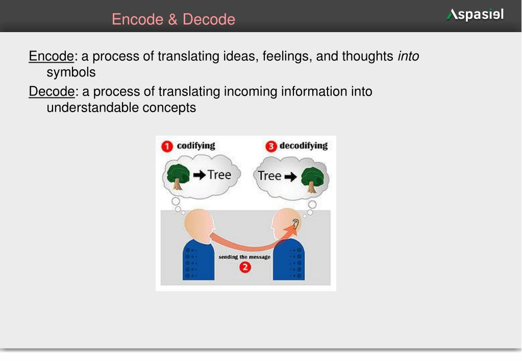 Encode: a process of translating ideas, feelings, and thoughts into symbols Decode: a process of translating incoming information into understandable concepts Encode & Decode