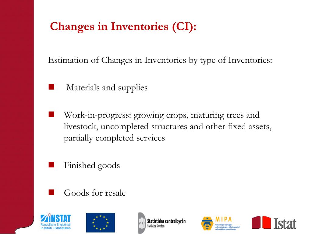 Changes in Inventories (CI): Estimation of Changes in Inventories by type of Inventories: • Materials and supplies • Work-in-progress: growing crops, maturing trees and livestock, uncompleted structures and other fixed assets, partially completed services • Finished goods • Goods for resale