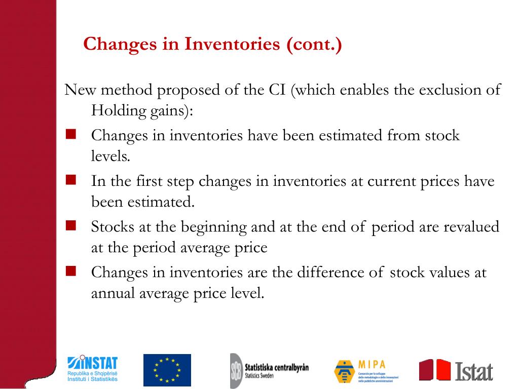 Changes in Inventories (cont.) New method proposed of the CI (which enables the exclusion of Holding gains): • Changes in inventories have been estimated from stock levels. • In the first step changes in inventories at current prices have been estimated. • Stocks at the beginning and at the end of period are revalued at the period average price • Changes in inventories are the difference of stock values at annual average price level.
