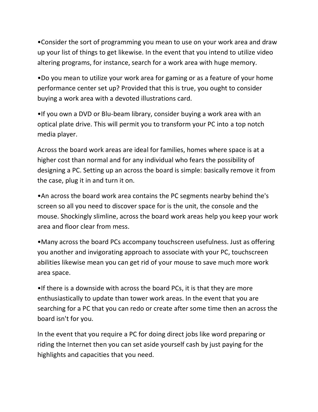 •Consider the sort of programming you mean to use on your work area and draw up your list of things to get likewise. In the event that you intend to utilize video altering programs, for instance, search for a work area with huge memory. •Do you mean to utilize your work area for gaming or as a feature of your home performance center set up? Provided that this is true, you ought to consider buying a work area with a devoted illustrations card. •If you own a DVD or Blu-beam library, consider buying a work area with an optical plate drive. This will permit you to transform your PC into a top notch media player. Across the board work areas are ideal for families, homes where space is at a higher cost than normal and for any individual who fears the possibility of designing a PC. Setting up an across the board is simple: basically remove it from the case, plug it in and turn it on. •An across the board work area contains the PC segments nearby behind the's screen so all you need to discover space for is the unit, the console and the mouse. Shockingly slimline, across the board work areas help you keep your work area and floor clear from mess. •Many across the board PCs accompany touchscreen usefulness. Just as offering you another and invigorating approach to associate with your PC, touchscreen abilities likewise mean you can get rid of your mouse to save much more work area space. •If there is a downside with across the board PCs, it is that they are more enthusiastically to update than tower work areas. In the event that you are searching for a PC that you can redo or create after some time then an across the board isn't for you. In the event that you require a PC for doing direct jobs like word preparing or riding the Internet then you can set aside yourself cash by just paying for the highlights and capacities that you need.