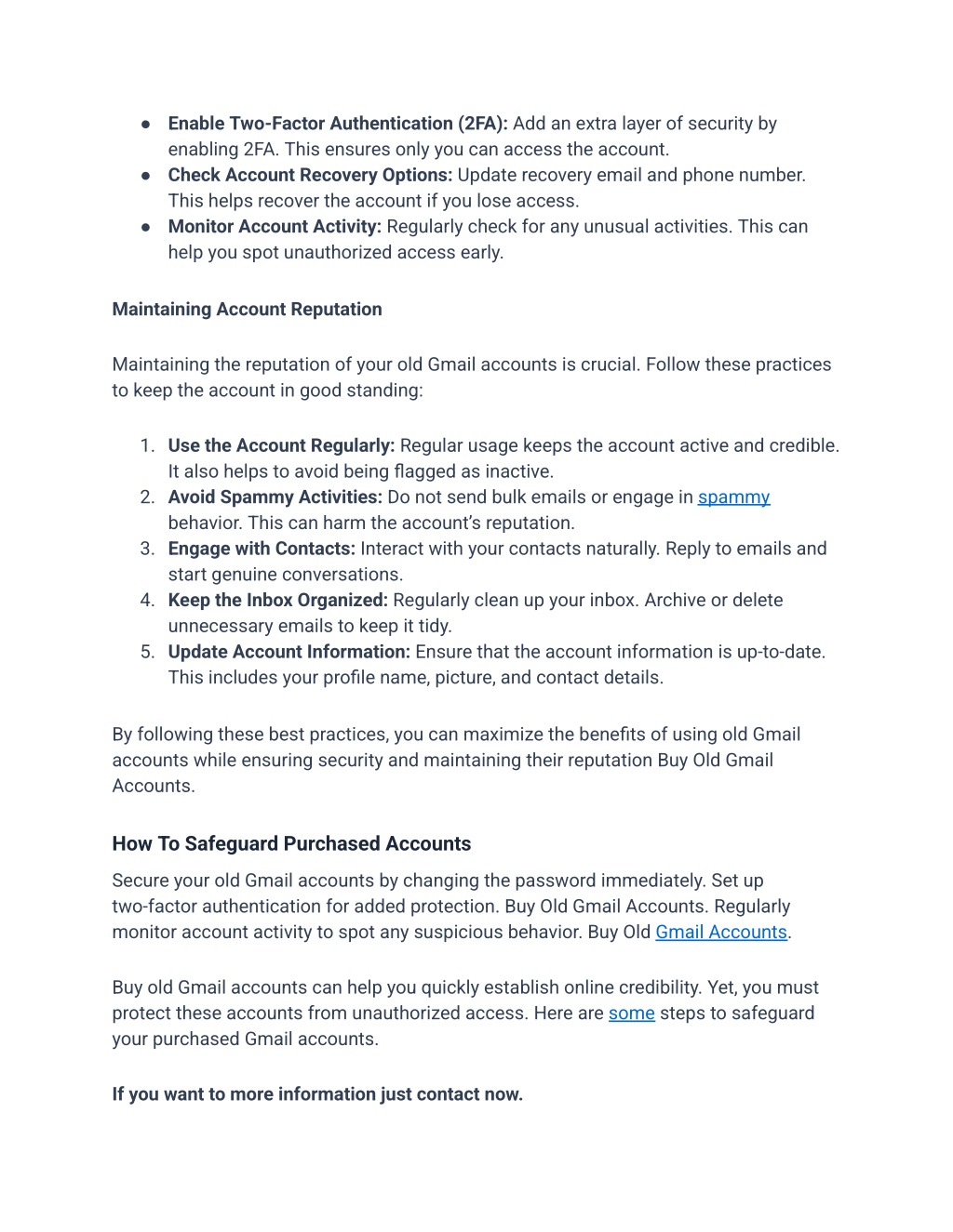 ● Enable Two-Factor Authentication (2FA): Add an extra layer of security by enabling 2FA. This ensures only you can access the account. ● Check Account Recovery Options: Update recovery email and phone number. This helps recover the account if you lose access. ● Monitor Account Activity: Regularly check for any unusual activities. This can help you spot unauthorized access early. Maintaining Account Reputation Maintaining the reputation of your old Gmail accounts is crucial. Follow these practices to keep the account in good standing: 1. Use the Account Regularly: Regular usage keeps the account active and credible. It also helps to avoid being flagged as inactive. 2. Avoid Spammy Activities: Do not send bulk emails or engage in spammy behavior. This can harm the account’s reputation. 3. Engage with Contacts: Interact with your contacts naturally. Reply to emails and start genuine conversations. 4. Keep the Inbox Organized: Regularly clean up your inbox. Archive or delete unnecessary emails to keep it tidy. 5. Update Account Information: Ensure that the account information is up-to-date. This includes your profile name, picture, and contact details. By following these best practices, you can maximize the benefits of using old Gmail accounts while ensuring security and maintaining their reputation Buy Old Gmail Accounts. How To Safeguard Purchased Accounts Secure your old Gmail accounts by changing the password immediately. Set up two-factor authentication for added protection. Buy Old Gmail Accounts. Regularly monitor account activity to spot any suspicious behavior. Buy Old Gmail Accounts. Buy old Gmail accounts can help you quickly establish online credibility. Yet, you must protect these accounts from unauthorized access. Here are some steps to safeguard your purchased Gmail accounts. If you want to more information just contact now.