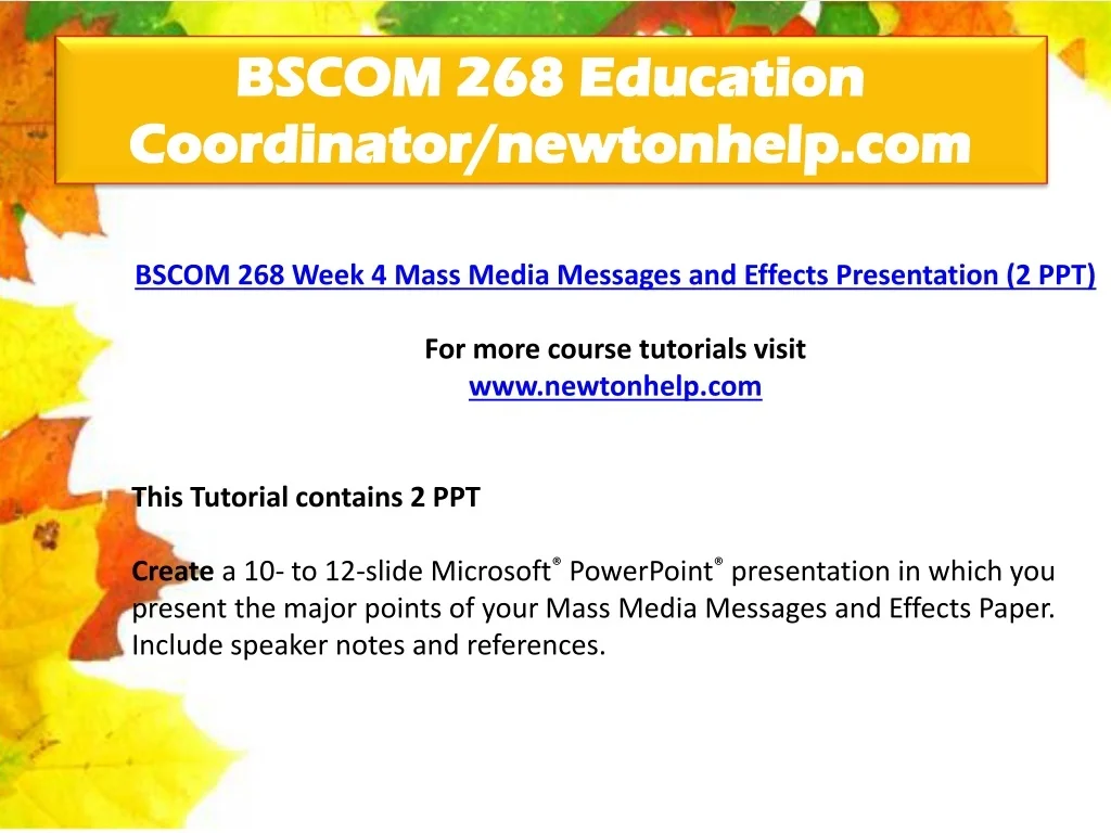 BSCOM 268 Education Coordinator/newtonhelp.com BSCOM 268 Week 4 Mass Media Messages and Effects Presentation (2 PPT) For more course tutorials visit www.newtonhelp.com This Tutorial contains 2 PPT Create a 10- to 12-slide Microsoft® PowerPoint® presentation in which you present the major points of your Mass Media Messages and Effects Paper. Include speaker notes and references.