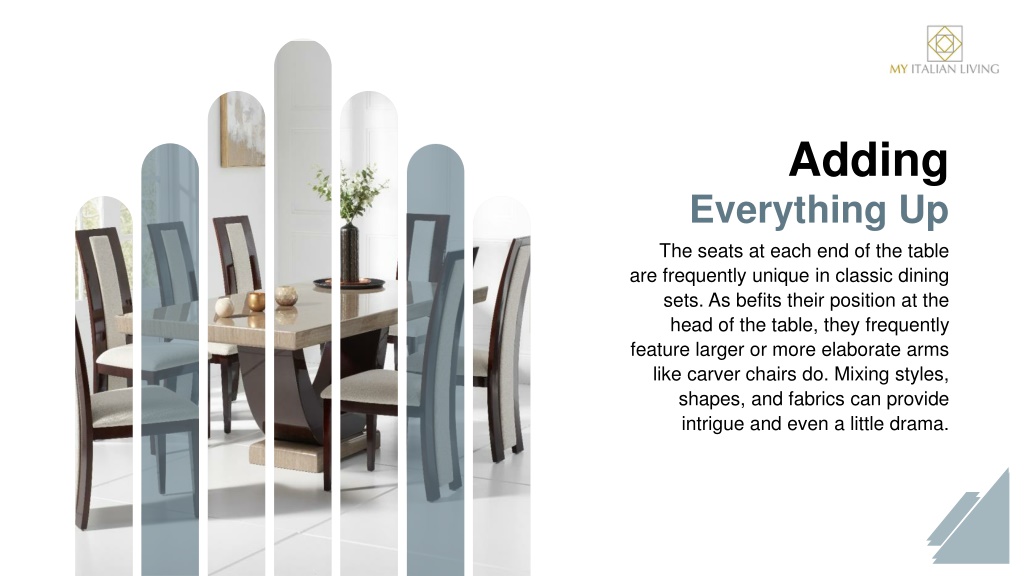 AddingEverything Up The seats at each end of the table are frequently unique in classic dining sets. As befits their position at the head of the table, they frequently feature larger or more elaborate arms like carver chairs do. Mixing styles, shapes, and fabrics can provide intrigue and even a little drama.