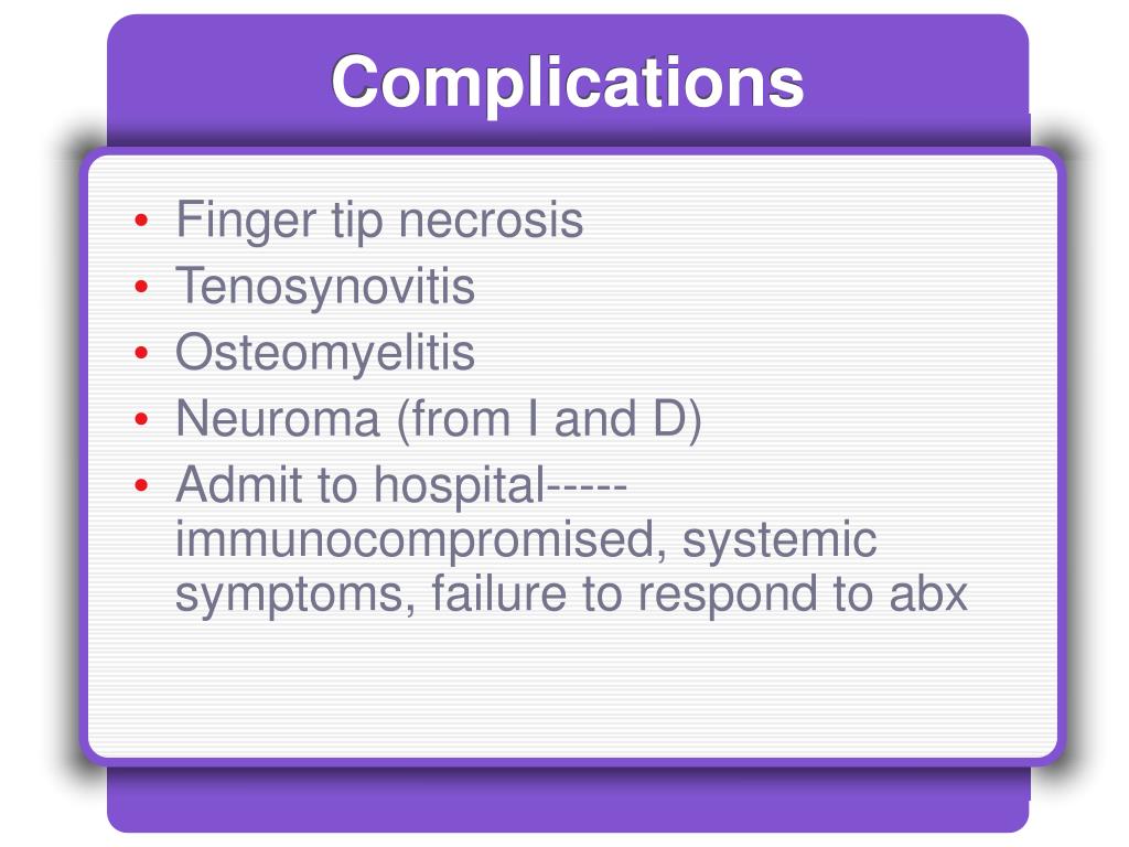 Complications • Finger tip necrosis • Tenosynovitis • Osteomyelitis • Neuroma (from I and D) • Admit to hospital----- immunocompromised, systemic symptoms, failure to respond to abx