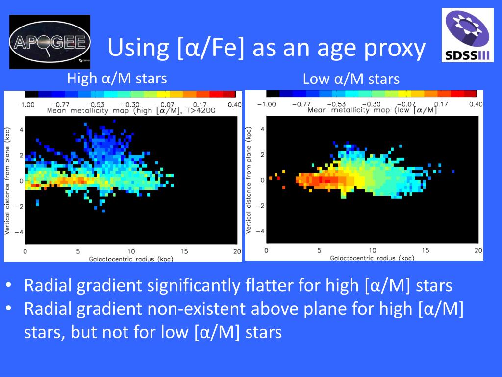 Using [α/Fe] as an age proxy High α/M stars Low α/M stars • Radial gradient significantly flatter for high [α/M] stars • Radial gradient non-existent above plane for high [α/M] stars, but not for low [α/M] stars