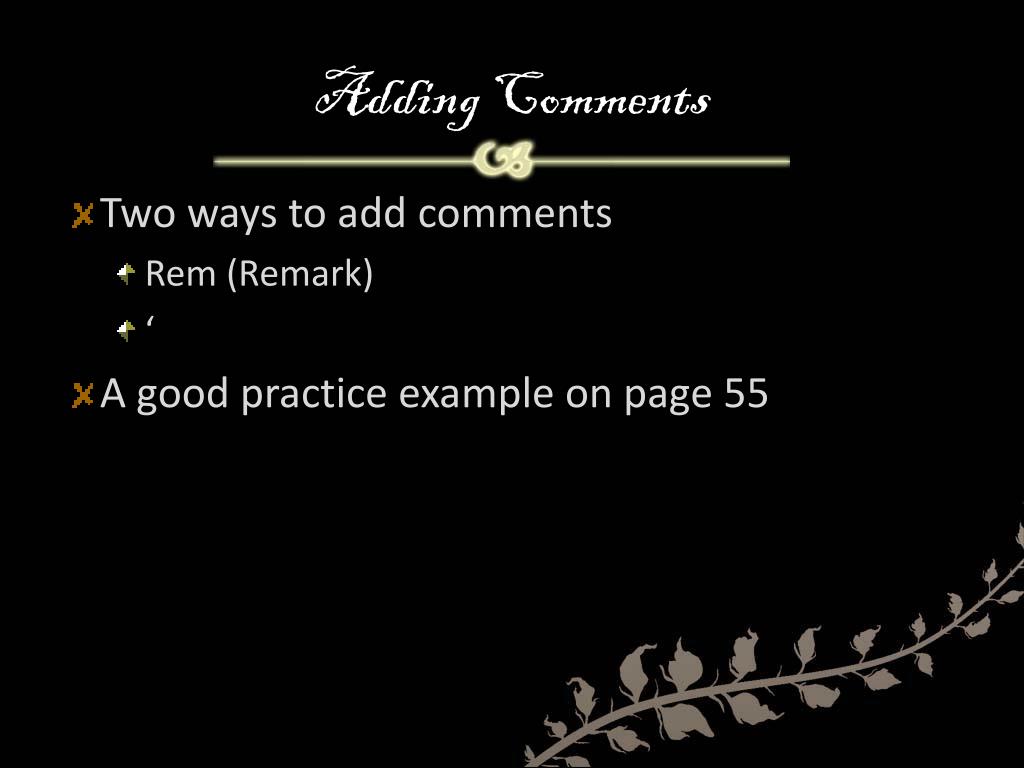 Adding Comments • Two ways to add comments • Rem (Remark) • ‘ • A good practice example on page 55