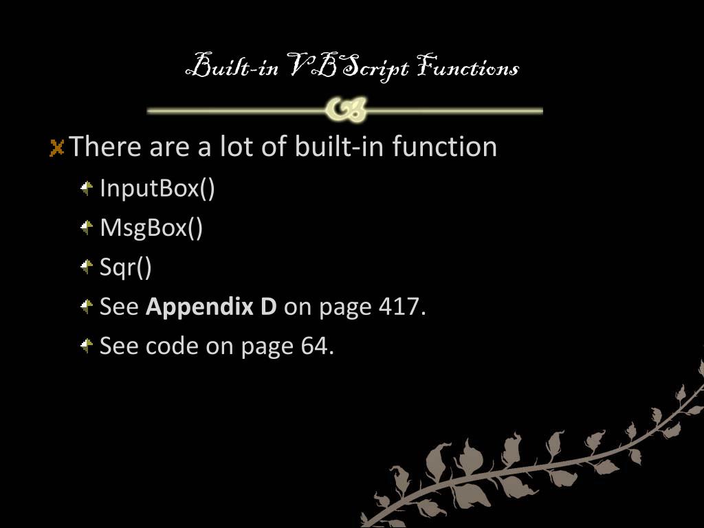 Built-in VBScript Functions • There are a lot of built-in function • InputBox() • MsgBox() • Sqr() • See Appendix D on page 417. • See code on page 64.
