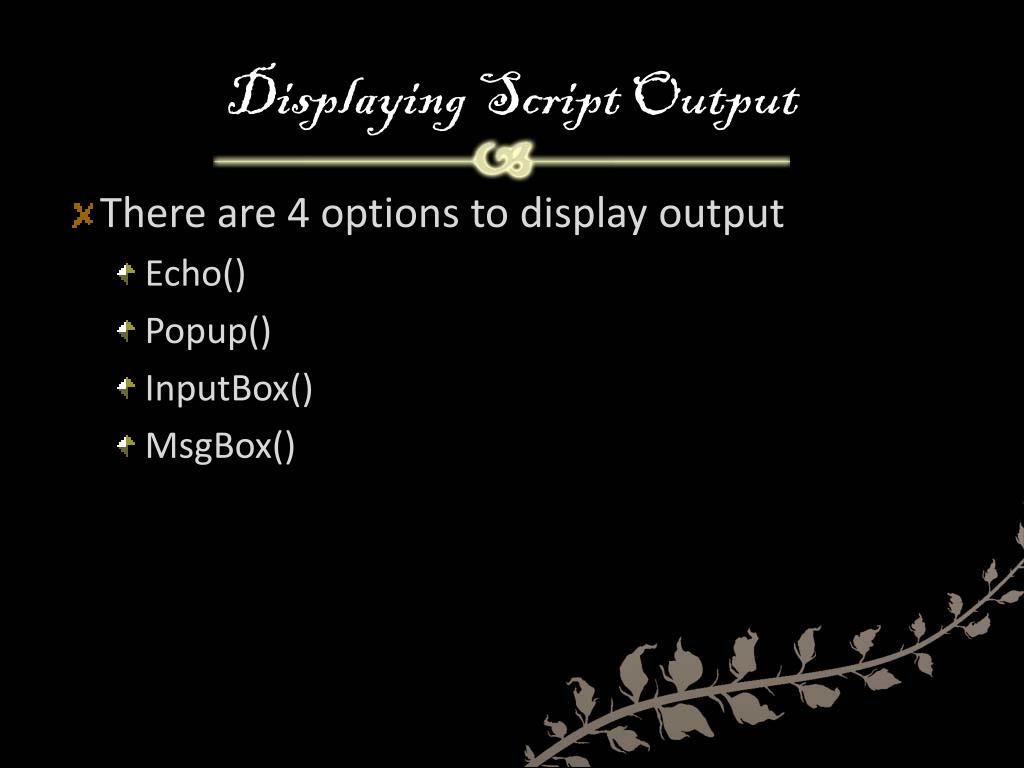 Displaying Script Output • There are 4 options to display output • Echo() • Popup() • InputBox() • MsgBox()