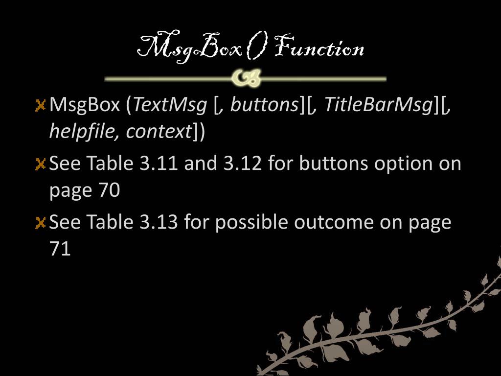 MsgBox() Function • MsgBox (TextMsg[, buttons][, TitleBarMsg][, helpfile, context]) • See Table 3.11 and 3.12 for buttons option on page 70 • See Table 3.13 for possible outcome on page 71