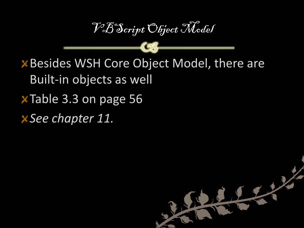 VBScript Object Model • Besides WSH Core Object Model, there are Built-in objects as well • Table 3.3 on page 56 • See chapter 11.