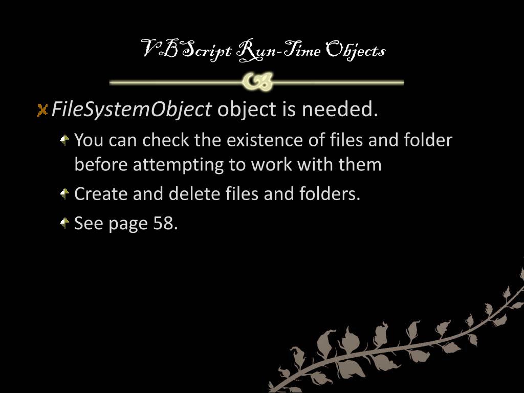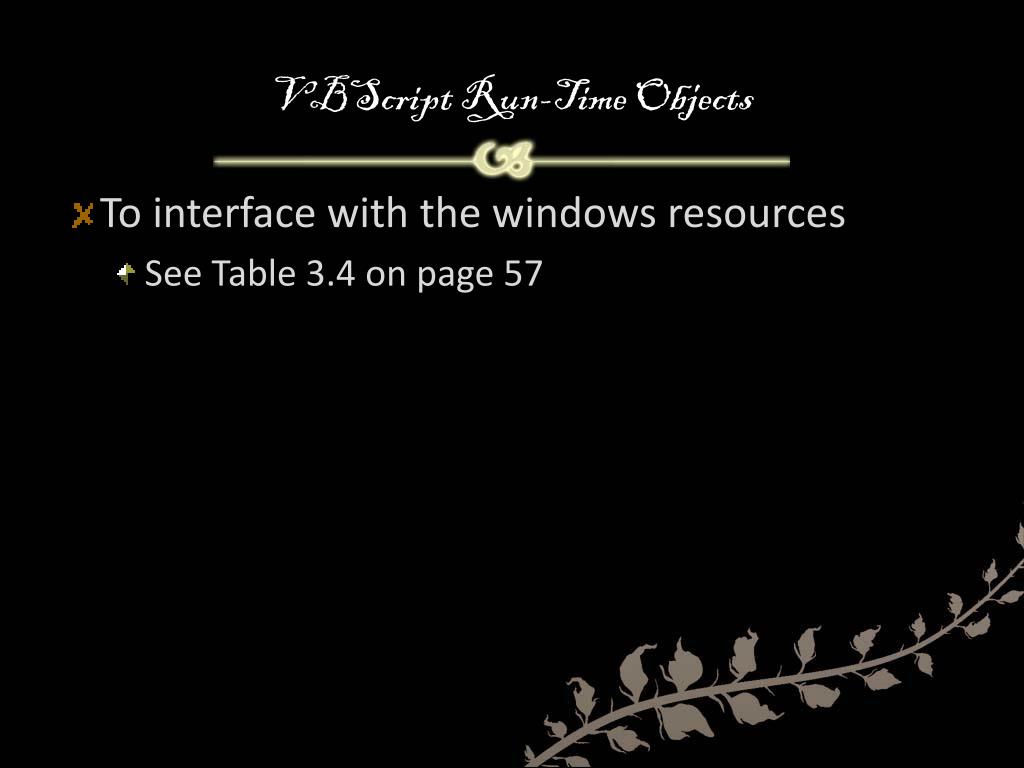 VBScript Run-Time Objects • To interface with the windows resources • See Table 3.4 on page 57