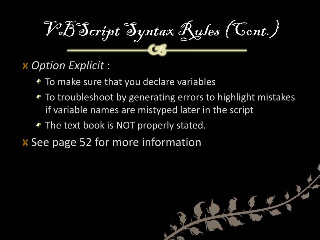 VBScript Syntax Rules (Cont.) • Option Explicit : • To make sure that you declare variables • To troubleshoot by generating errors to highlight mistakes if variable names are mistyped later in the script • The text book is NOT properly stated. • See page 52 for more information