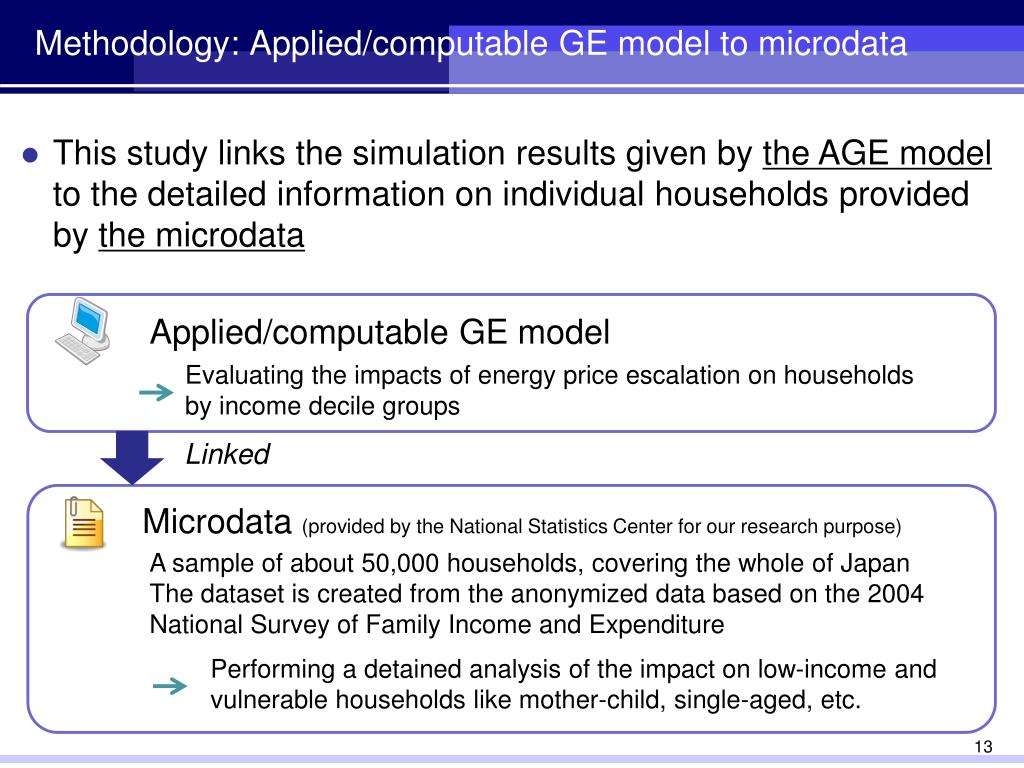 Methodology: Applied/computable GE model to microdata • This study links the simulation results given by the AGE model to the detailed information on individual households provided by the microdata Applied/computable GE model Evaluating the impacts of energy price escalation on households by income decile groups Linked Microdata (provided by the National Statistics Center for our research purpose) A sample of about 50,000 households, covering the whole of Japan The dataset is created from the anonymized data based on the 2004 National Survey of Family Income and Expenditure Performing a detained analysis of the impact on low-income and vulnerable households like mother-child, single-aged, etc.