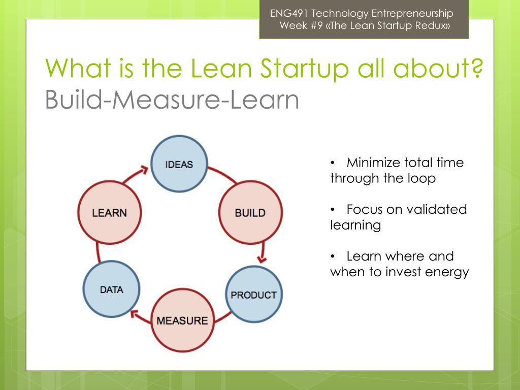 ENG491 Technology Entrepreneurship Week #9«TheLeanStartupRedux» What is theLeanStartupall about?Build-Measure-Learn • Minimize total time • through the loop • Focus on validated • learning • Learn where and • when to invest energy