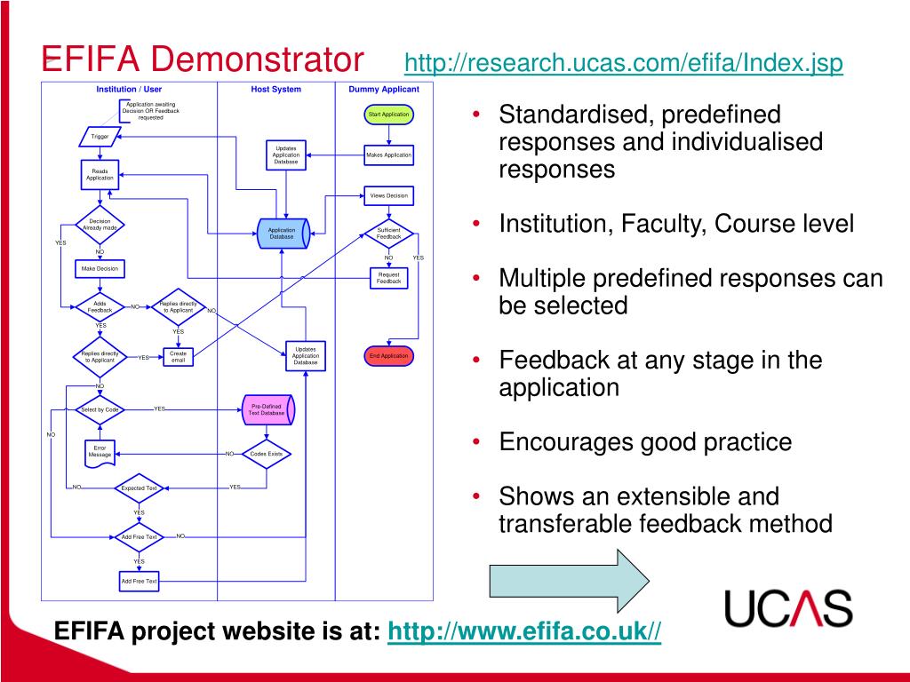 EFIFA Demonstrator http://research.ucas.com/efifa/Index.jsp • Standardised, predefined responses and individualised responses • Institution, Faculty, Course level • Multiple predefined responses can be selected • Feedback at any stage in the application • Encourages good practice • Shows an extensible and transferable feedback method EFIFA project website is at: http://www.efifa.co.uk//