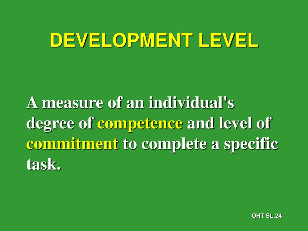 DEVELOPMENT LEVEL A measure of an individual's degree of competence and level of commitment to complete a specific task.