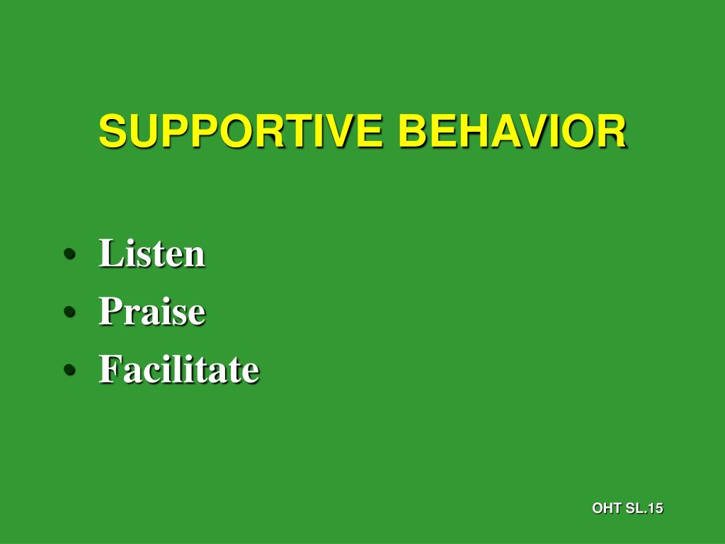 SUPPORTIVE BEHAVIOR • Listen • Praise • Facilitate