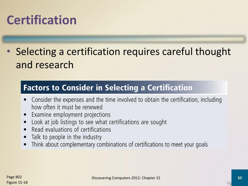 Certification • Selecting a certification requires careful thought and research Discovering Computers 2012: Chapter 15 Page 802 Figure 15-18
