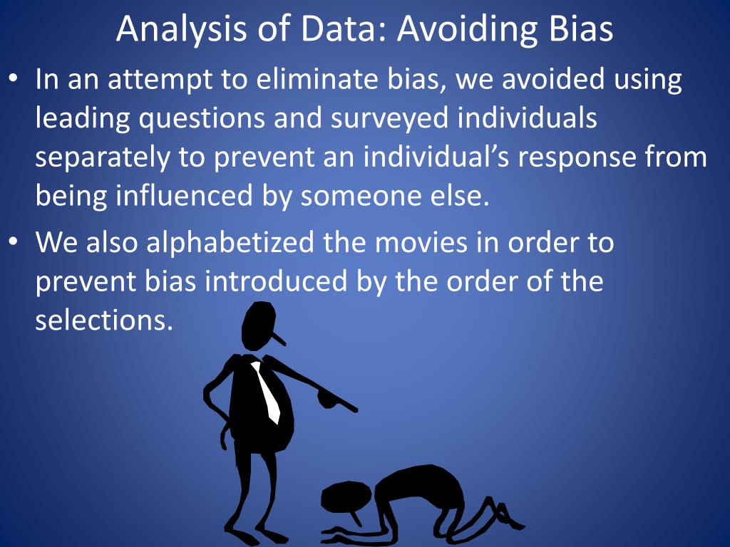 Analysis of Data: Avoiding Bias • In an attempt to eliminate bias, we avoided using leading questions and surveyed individuals separately to prevent an individual’s response from being influenced by someone else. • We also alphabetized the movies in order to prevent bias introduced by the order of the selections.
