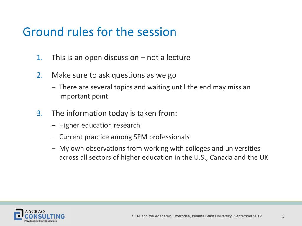 Ground rules for the session • This is an open discussion – not a lecture • Make sure to ask questions as we go • There are several topics and waiting until the end may miss an important point • The information today is taken from: • Higher education research • Current practice among SEM professionals • My own observations from working with colleges and universities across all sectors of higher education in the U.S., Canada and the UK