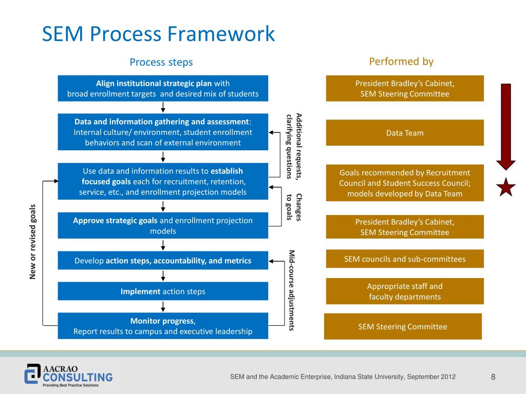 SEM Process Framework Performed by Process steps Align institutional strategic plan with broad enrollment targets and desired mix of students President Bradley’s Cabinet, SEM Steering Committee Data and information gathering and assessment: Internal culture/ environment, student enrollment behaviors and scan of external environment Data Team Additional requests, clarifying questions Use data and information results to establish focused goals each for recruitment, retention, service, etc., and enrollment projection models Goals recommended by Recruitment Counciland Student Success Council; models developed by Data Team Changes to goals Approve strategic goals and enrollment projection models President Bradley’s Cabinet, SEM Steering Committee New or revised goals SEM councils and sub-committees Develop action steps, accountability, and metrics Appropriate staff and faculty departments Implement action steps Mid-course adjustments • Monitor progress, • Report results to campus and executive leadership SEM Steering Committee