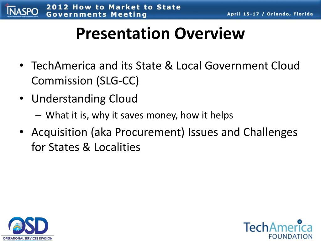 Presentation Overview • TechAmerica and its State & Local Government Cloud Commission (SLG-CC) • Understanding Cloud • What it is, why it saves money, how it helps • Acquisition (aka Procurement) Issues and Challenges for States & Localities